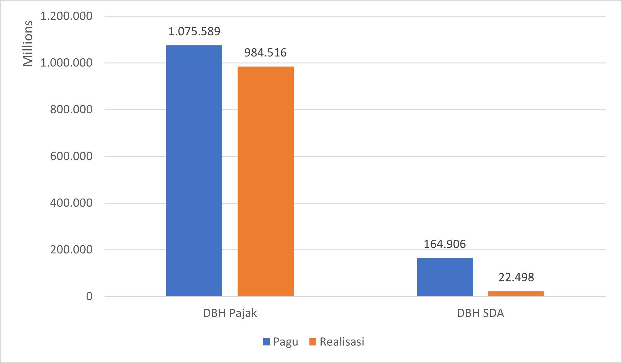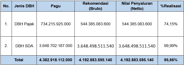 KPPN Balikpapan juga menyalurkan DBH dengan pagu sebesar Rp4.382.918.112.000,-. DBH Pajak secara umum terdiri dari dua jenis yaitu DBH Pajak dan DBH SDA. Pada wilayah kerja KPPN Balikpapan, pagu penyaluran DBH SDA lebih besar daripada pagu penyaluran DBH Pajak. Sampai dengan 30 November 2025, KPPN Balikpapan telah menyalurkan sebesar 95,66% dari pagu alokasi DBH.