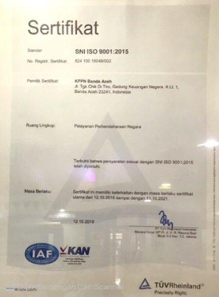 Pada tahun 2020 kemaren KPPN Banda Aceh menjadi salah satu dari sekian banyak KPPN yang dipercaya untuk menjadi auditee ISO 9001:2015. KPPN Banda Aceh berhasil melanjutkan sertifikat ISO 9001 : 2015 dan SNI ISO 9001:2015 hal ini dapat tercapai berkat kerja sama dan sinergi yang dibangun oleh KPPN Banda Aceh dan dukungan dari para stakeholder yang senantiasa memberikan kepercayaan kepada KPPN Banda Aceh.