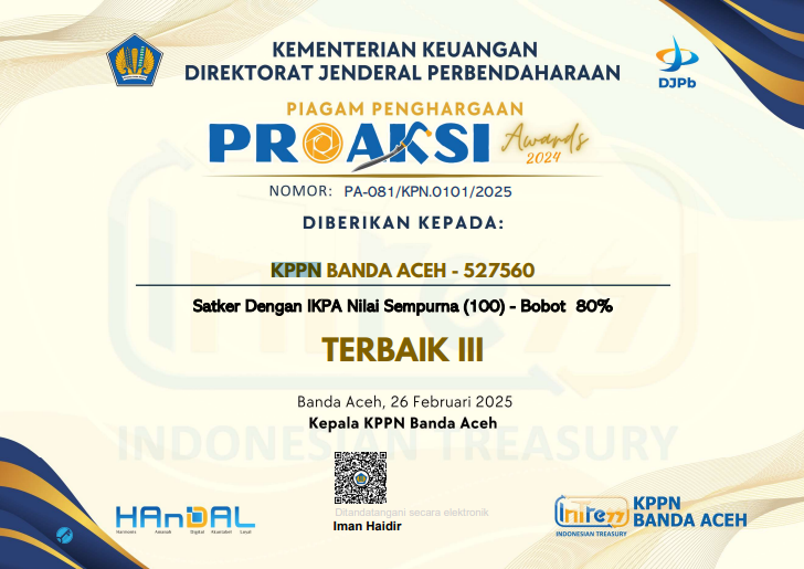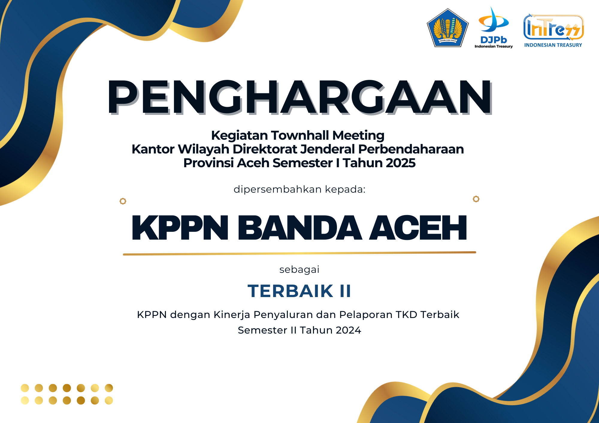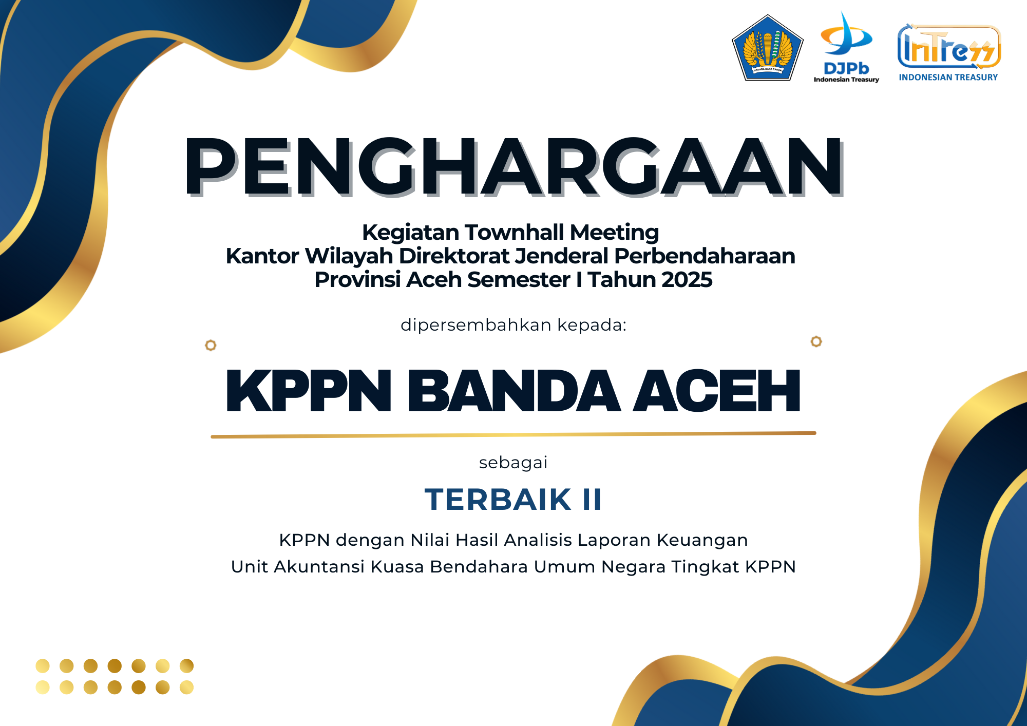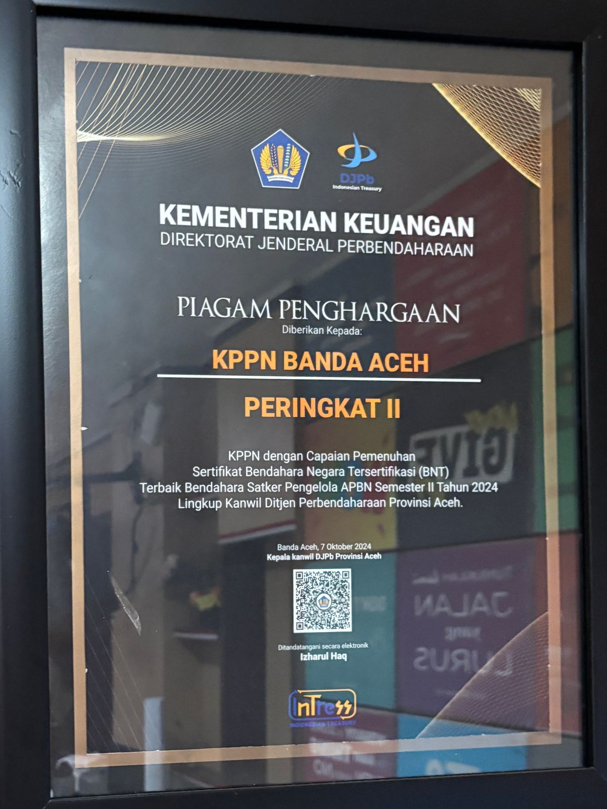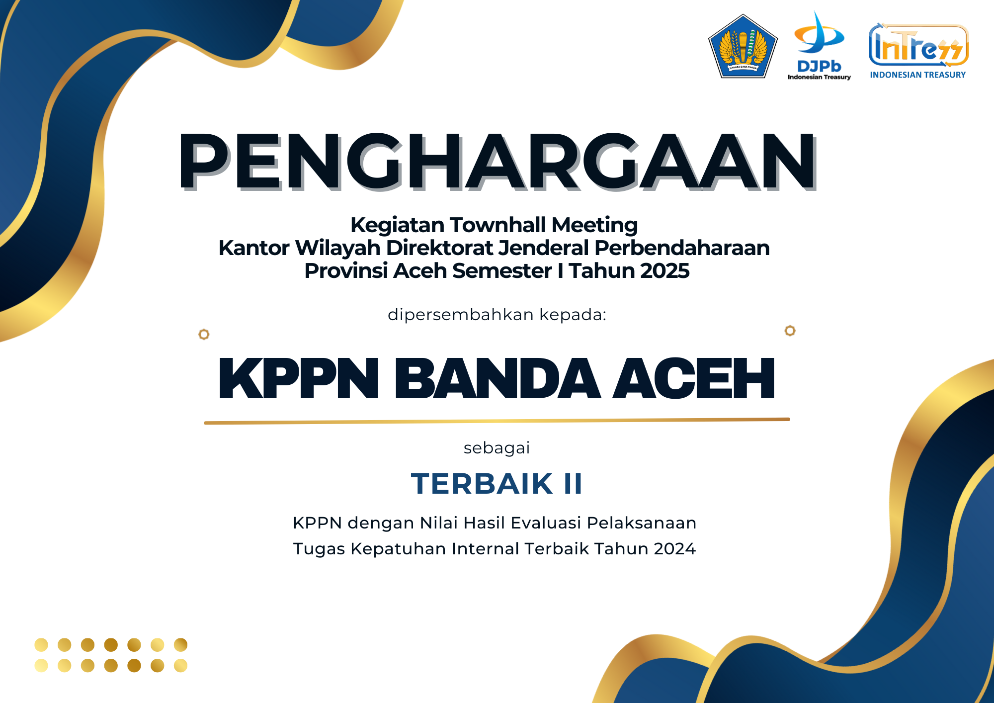 Adapun, beberapa penghargaan dan prestasi KPPN Banda Aceh dalam beberapa tahun terakhir adalah sebagai berikut: