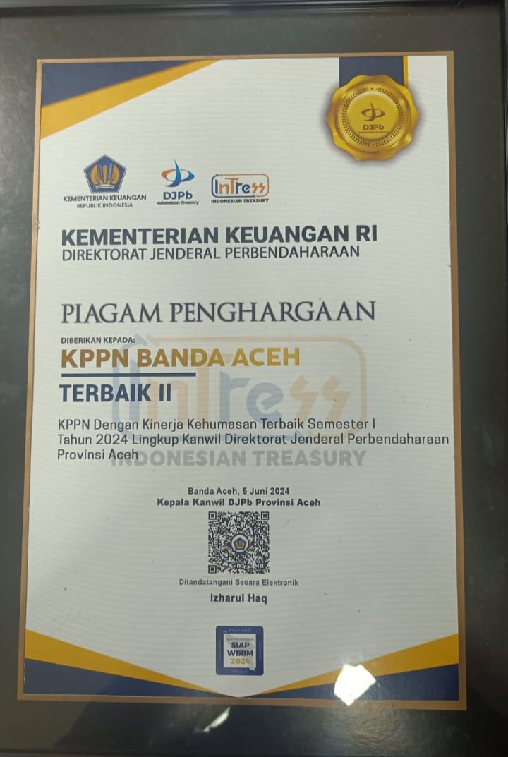 - Penghargaan Satuan Kerja dengan Nilai IKPA Sempurna Triwulan II Tahun 2022 dari Kanwil Ditjen Perbendaharaan Provinsi Aceh.