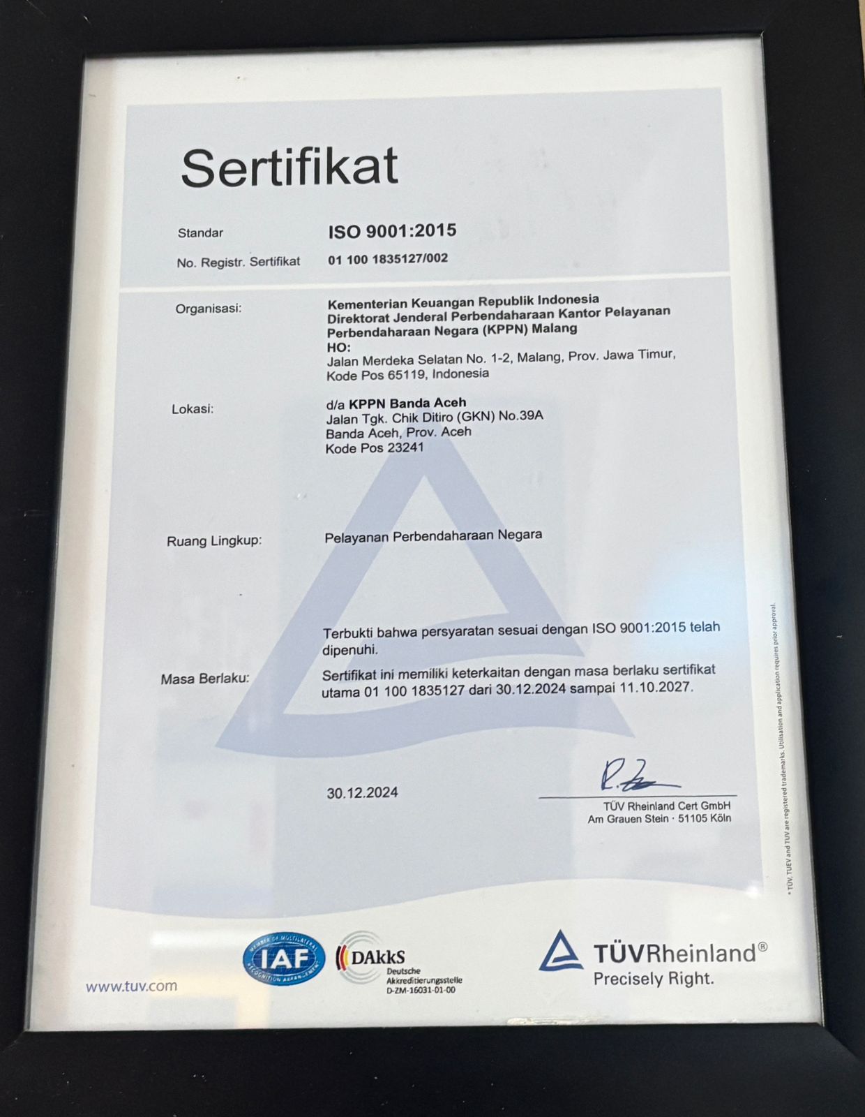 Untuk mendukung tercapainya visi Ditjen Perbendaharaan, yaitu : "Menjadi pengelola Perbendaharaan Negara yang Unggul di Tingkat Dunia", KPPN Banda Aceh telah bekerja keras mengembangkan segala potensi yang dimiliki untuk mewujudkan pelayanan prima kepada stakeholders. Kerja keras ini berhasil membuahkan sertifikat ISO 9001 : 2015 yang diterbitkan oleh Tuv Reheinland. Sertifikat ISO 9001 : 2015 merupakan prestasi tertinggi di bidang pelayanan publik.