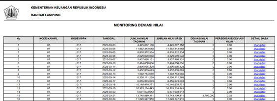 Pada tabel tersebut bisa dicek bahwa pada tanggal 21 Maret 2025 terbentuk deviasi sebesar 0,02. Lebih lanjut, ketika diteliti ternyata deviasi tersebut terbentuk dari SPM/SPP yang jatuh temponya pada tanggal 21 Maret 2025 namun SPP nya tidak dihapus pada hari-H tersebut melainkan H+1 sehingga akhirnya membentuk deviasi.