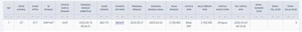 - Terlihat pada tabel tersebut pada kolom “Tgl hapus SPM” bahwa satuan kerja melakukan penghapusan pada tanggal 24 Maret 2025, yang seharusnya dilakukan pada tanggal 21 Maret 2025. Atas kondisi tersebut, yang akhirnya menyebabkan deviasi.