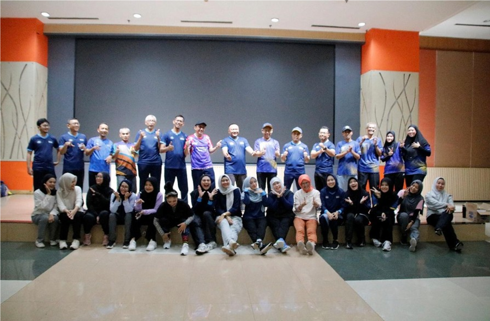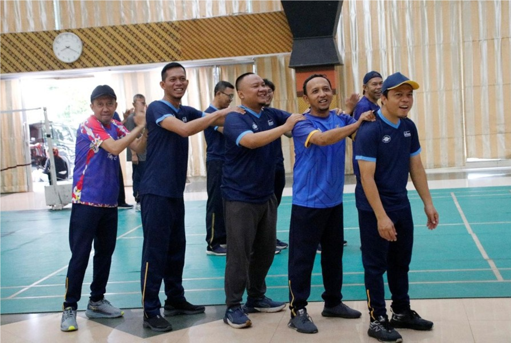Terlihat para pegawai mengikuti senam dengan antusias di dalam ruangan auditorium yang luas. Selain senam bersama, suasana kebersamaan juga tampak melalui interaksi santai dan kegiatan kelompok yang mempererat hubungan antarpegawai.