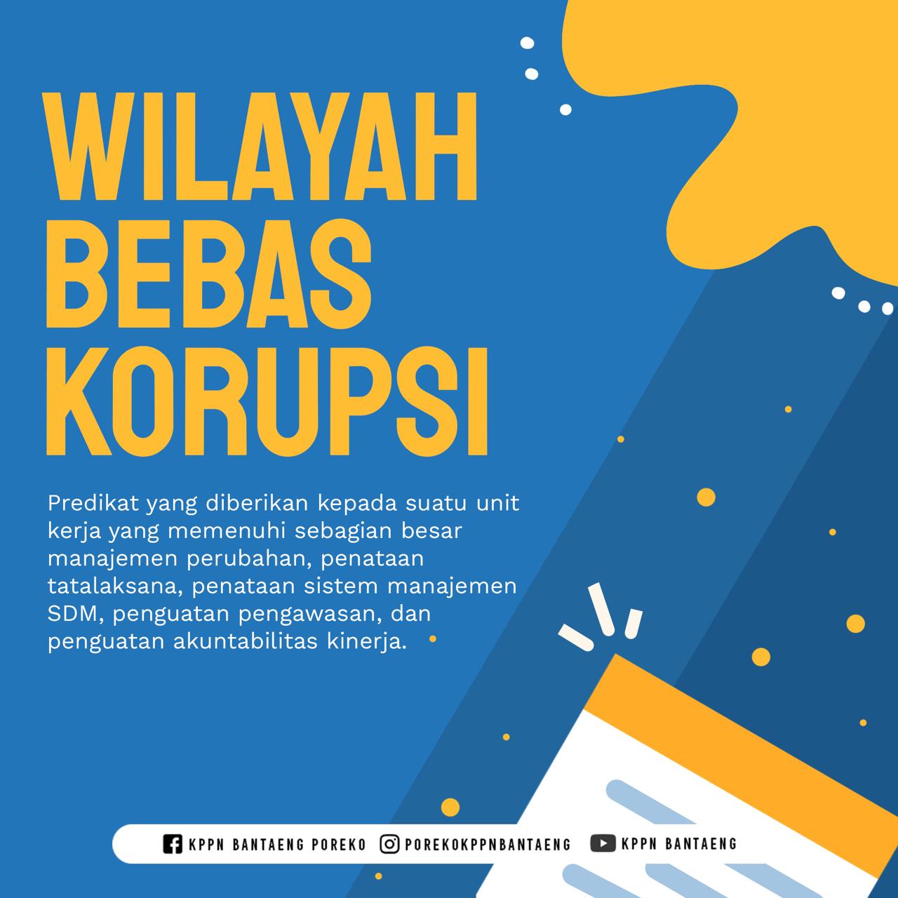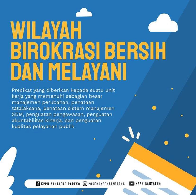 Sehubungan dengan Nota Dinas Direktur Jenderal Perbendaharaan nomor ND-40/PB/2021 tanggal 28 Januari 2021 hal Penetapan Unit Kerja yang Mengikuti Penilaian Unit Kerja Berpredikat Wilayah Bebas dari Koripsi (WBK) dan Wilayah Birokrasi Bersih dan Melayani (WBBM) di Tingkat Nasional Tahun 2021, KPPN Bantaeng ditunjuk sebagai salah satu Unit Kerja di Direktorat Jenderal Perbendaharaan untuk mengikuti penilaian WBK pada tahun 2021. Apa yang dimaksud dengan ZI, WBK, dan WBBM? Mari simak postingan berikut ini.