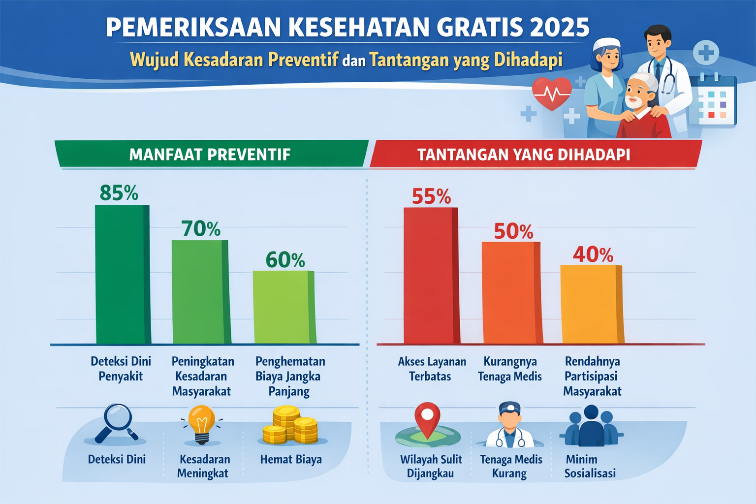 Di balik keberhasilan peningkatan kepedulian masyarakat, program PKG 2025 membawa beban finansial yang sangat berat bagi sistem Jaminan Kesehatan Nasional. Peningkatan deteksi dini secara otomatis meningkatkan jumlah rujukan dan utilisasi layanan kesehatan lanjutan, yang berimplikasi langsung pada rasio klaim BPJS Kesehatan. Untuk menjaga keberlangsungan sistem, BPJS Kesehatan mengembangkan inisiatif "OCCUR 2025" (Optimalization of Claims and Coverage Utilization Review). Program ini bertujuan memperkuat budaya kerja berbasis data guna meminimalkan kesalahan administratif, duplikasi klaim, dan mendeteksi potensi kecurangan (fraud) dalam proses verifikasi. Salah satu programnya yaitu BPJS Kesehatan Cabang Banyuwangi terus mendorong optimalisasi Program Rujuk Balik (PRB) untuk penyakit kronis seperti diabetes dan hipertensi. Pasien yang telah terdeteksi melalui skrining PKG dan kondisinya sudah stabil diarahkan untuk kembali mendapatkan perawatan rutin di FKTP (Puskesmas atau Klinik), sehingga biaya klaim di tingkat Rumah Sakit yang lebih mahal dapat dikendalikan. Selain BPJS Kesehatan, dari sektor asuransi kesehatan swasta juga mengalami guncangan yang tidak kalah hebat pada tahun 2025. PKG 2025 yang meningkatkan deteksi dini, dikombinasikan dengan inflasi medis global, menciptakan tekanan ganda terhadap profitabilitas perusahaan asuransi komersial di Indonesia. Inflasi medis di Indonesia pada tahun 2025 diperkirakan menyentuh angka 16% hingga 19%. Kenaikan ini dipicu oleh mahalnya teknologi peralatan kesehatan baru, kenaikan harga obat-obatan impor, serta peningkatan permintaan layanan kesehatan pasca-pandemi yang memicu lonjakan klaim secara frekuensi maupun nilai. Sebagai konsekuensinya, perusahaan asuransi terpaksa melakukan penyesuaian harga atau repricing terhadap produk-produk asuransi kesehatan mereka. Kenaikan premi ini memicu kekhawatiran akan terjadinya "eksklusifitas kesehatan", di mana masyarakat kelas menengah mulai merasa tidak mampu lagi membeli asuransi kesehatan komersial.