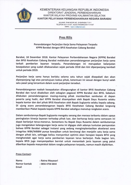 Barabai, 18 Desember 2018. Kantor Pelayanan Perbendaharaan Negara Barabai dan BPJS Kesehatan Cabang Barabai melakukan penandatanganan perjanjian kerjasama terkait pemberian layanan terpadu. Penandatanganan ini merupakan kelanjutan kesepakatan yang sudah dilaksanakan sejak periode 2018 dan kini diperpanjang kembali untuk periode 2019.