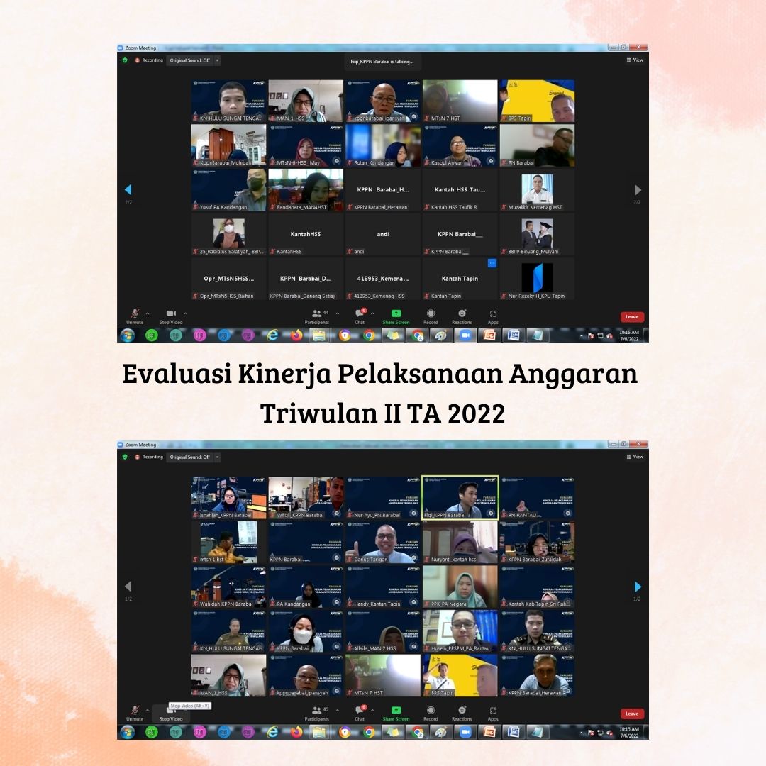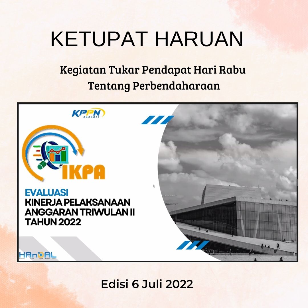 Dalam rangka mengoptimalkan pencapaian IKPA pada satker di lingkup KPPN Barabai, diselenggarakan Evaluasi Kinerja Pelaksanaan Anggaran Triwulan II Tahun 2022 melalui kegiatan Ketupat Haruan (Kegiatan Tukar Pendapat Hari Rabu Tentang Perbendaharaan) KPPN Barabai Edisi 6 Juli 2022 secara online via Zoom.