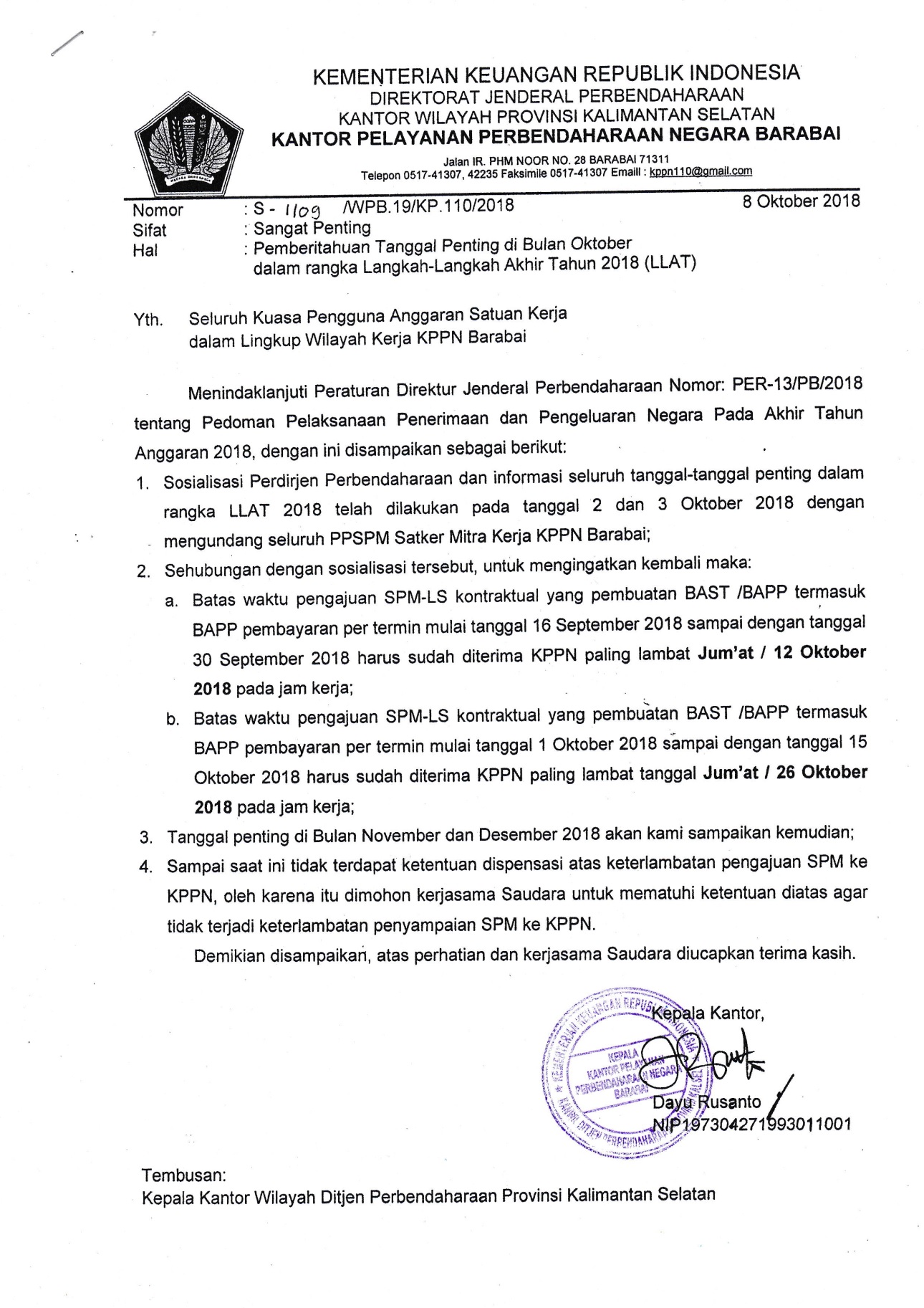 Menindaklanjuti Peraturan Direktur Jenderal Perbendaharaan Nomor PER-13/PB/2018 tentang pedoman Pelaksanaan Penerimaan dan Pengeluaran Negara pada Akhir Tahun Anggaran dengan disampaikan