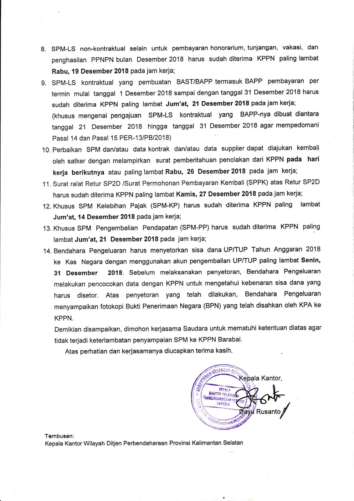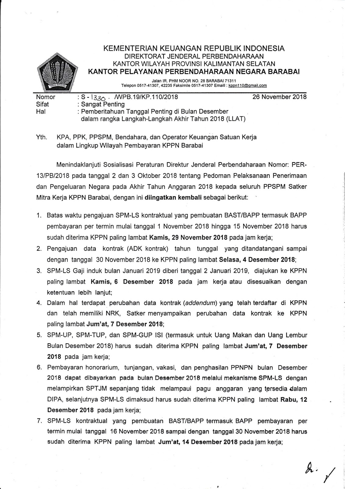 Demikian disampaikan, dimohon kerjasamanya agar tidak terjadi keterlambatan penyampaian SPM ke KPPN Barabai