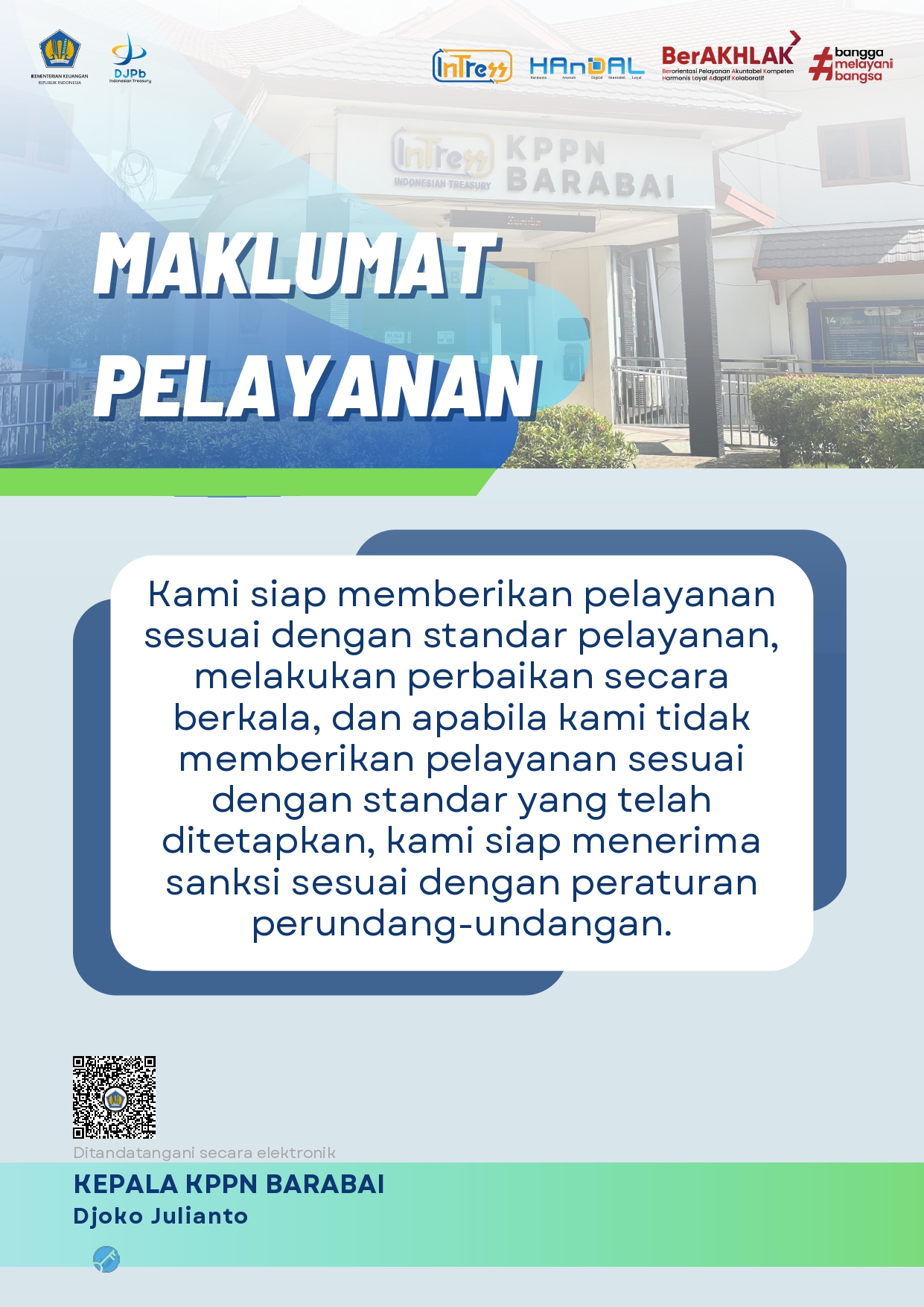 Kami siap memberikan pelayanan sesuai dengan standar pelayanan, melakukan perbaikan secara berkala, dan apabila kami tidak memberikan pelayanan sesuai dengan standar yang telah ditetapkan, kami siap menerima sanksi sesuai dengan peraturan perundang-undangan.