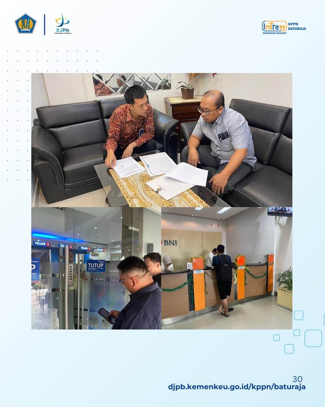 Monev Kepatuhan Collecting Agent Akhir Tahun 2024 Selasa, 31 Desember 2024 KPPN Baturaja melakukan uji petik secara onsite dengan mengunjungi beberapa bank/collecting agen di wilayah kerja KPPN Baturaja guna monev kepatuhan collecting agent. Monev dilakukan di hari kerja terakhir di beberapa bank diantaranya BRI, Mandiri, BSI, dan Bank Sumsel Babel baik di OKU, OKU Timur, dan OKU Selatan. #kemenkeu #kemenkeusatu #djpb #djpbsumsel