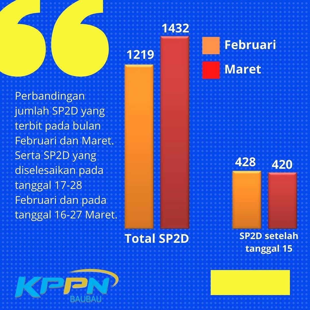 Walaupun harus #WorkFromHome , KPPN Baubau mengusahakan agar layanan yg kami berikan gak kaleng-kaleng. #WorkFromHome bukan alasan untuk bermalas-malasan. Berikut kami tampilkan grafik jumlah SP2D yang kami selesaikan di bulan Februari 2020 (sebelum kebijakan #WorkFromHome ) dan Maret 2020 (setelah #WorkFromHome )