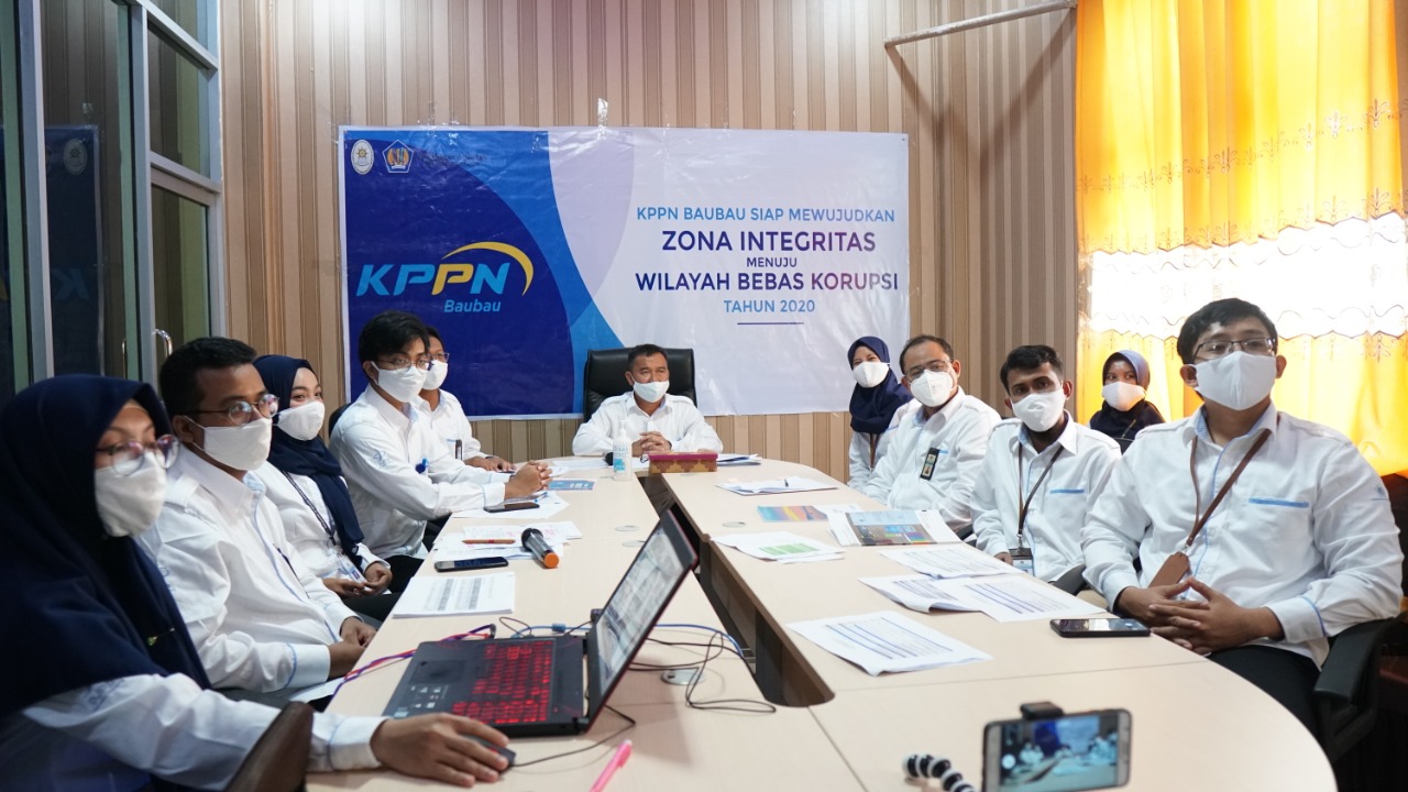 Kantor Pelayanan Perbendaharaan Negara Baubau mengikuti peninjauan lapangan (field evaluation) penilaian Wilayah Bebas Korupsi (WBK) tahun 2020 yang dilaksanakan secara daring melalui video conference, Kamis 26 November 2020.
