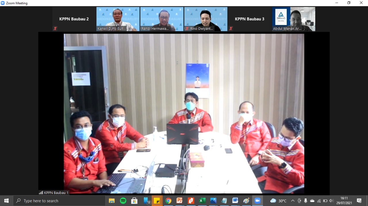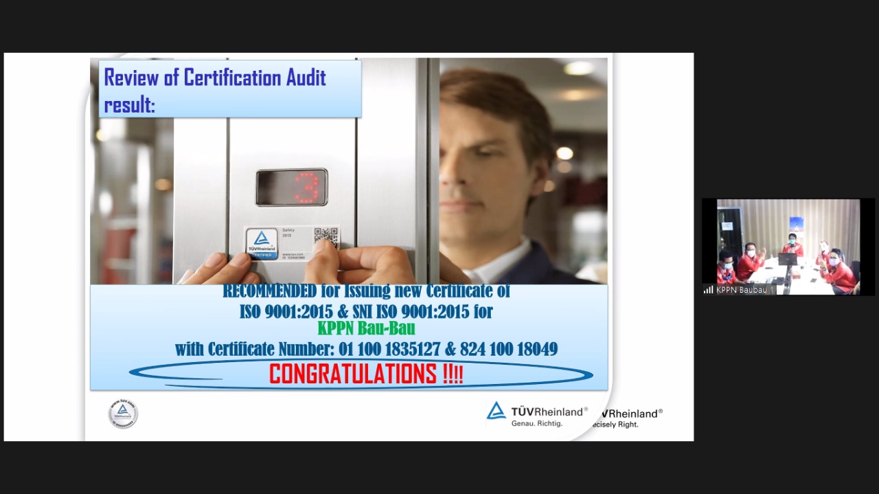 Pelaksanaan re-sertifikasi SMM ISO tahun 2021 dilaksanakan mulai tanggal 26 sampai dengan 30 Juli 2021 dan KPPN Baubau mendapat jadwal penilaian pada hari Kamis tanggal 29 Juli 2021 yang dilaksanakan melalui media Zoom Metting mulai pukul 09.00 sampai dengan pukul 16.00 WITA. Sebagai hasil dari kepatuhan dan konsistensi implementasi manajemen mutu selama ini, serta kerja keras dan sinergi semua pegawai KPPN Baubau, alhamdulillah proses audit re-sertifikasi SMM ISO 9001:2015 berjalan dengan baik dan lancar. Pada closing metting untuk penilaian pada KPPN Baubau auditor menyampaikan bahwa pada KPPN Baubau tidak terdapat temuan baik minor maupun mayor, sehingga KPPN Baubau dinyatakan lulus dalam proses re-sertifikasi SMM ISO tahun 2021.