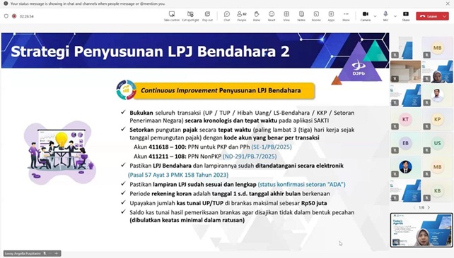 BAU-BAU – Dalam upaya memperkuat transparansi dan akuntabilitas pengelolaan keuangan negara, Kantor Pelayanan Perbendaharaan Negara (KPPN) Tipe A2 Bau-Bau menyelenggarakan kegiatan Bimbingan Teknis (Bimtek) Penyusunan dan Penyampaian Laporan Pertanggungjawaban (LPJ) Bendahara pada Kamis (28/08/2025). Kegiatan yang dilaksanakan secara daring melalui media Microsoft Teams ini diikuti oleh para Bendahara dan Operator Modul Bendahara dari 105 Satuan Kerja (Satker) mitra kerja KPPN Bau-Bau.