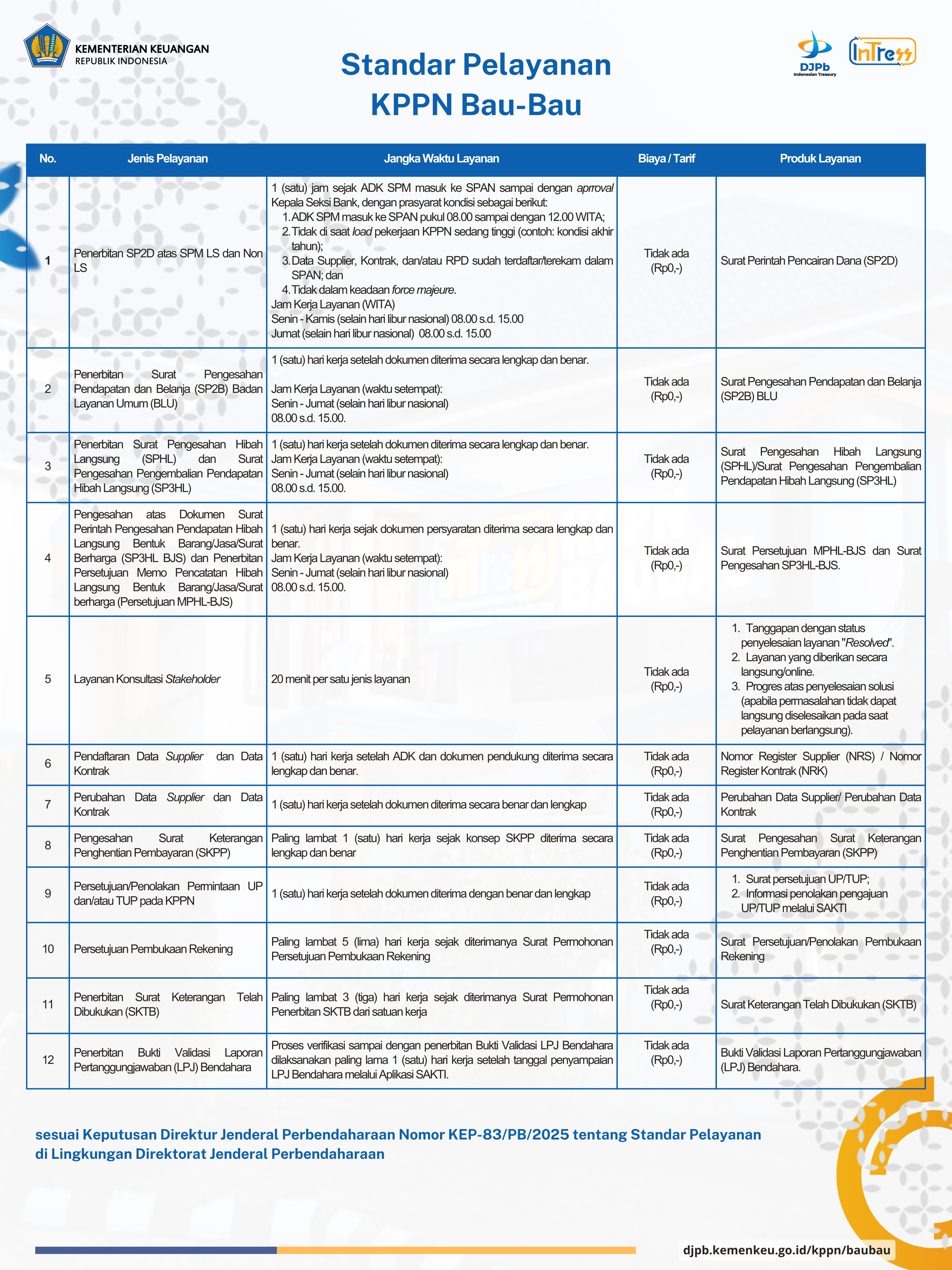 Sesuai Keputusan Direktur Jenderal Perbendaharaan Nomor KEP-83/PB/2025 tentang Standar Pelayanan Di Lingkungan Direktorat Jenderal Perbendaharaan.