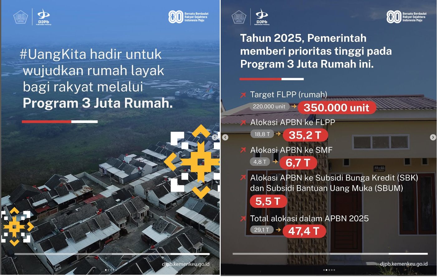 Hingga Semester I tahun 2025, program ini telah terealisasi sebesar Rp18,8 triliun untuk 115 ribu unit rumah. Tahun 2025, pemerintah juga meningkatkan target FLPP dari 220.000 menjadi 350.000 rumah subsidi demi mempercepat kepemilikan rumah layak bagi masyarakat.