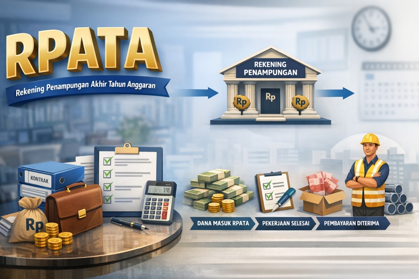 Dalam praktiknya, terdapat kondisi di mana prestasi pekerjaan belum dapat diterima hingga akhir tahun anggaran, meskipun pekerjaan telah berjalan dan membutuhkan kepastian pendanaan. Untuk menjawab kondisi tersebut, Kementerian Keuangan memfasilitasi mekanisme Rekening Penampungan Akhir Tahun Anggaran (RPATA) sebagai tata cara pembayaran pada akhir tahun anggaran atas pekerjaan yang belum diselesaikan, di mana dana terlebih dahulu ditampung dalam rekening penampungan sebelum dibayarkan kepada penyedia.
