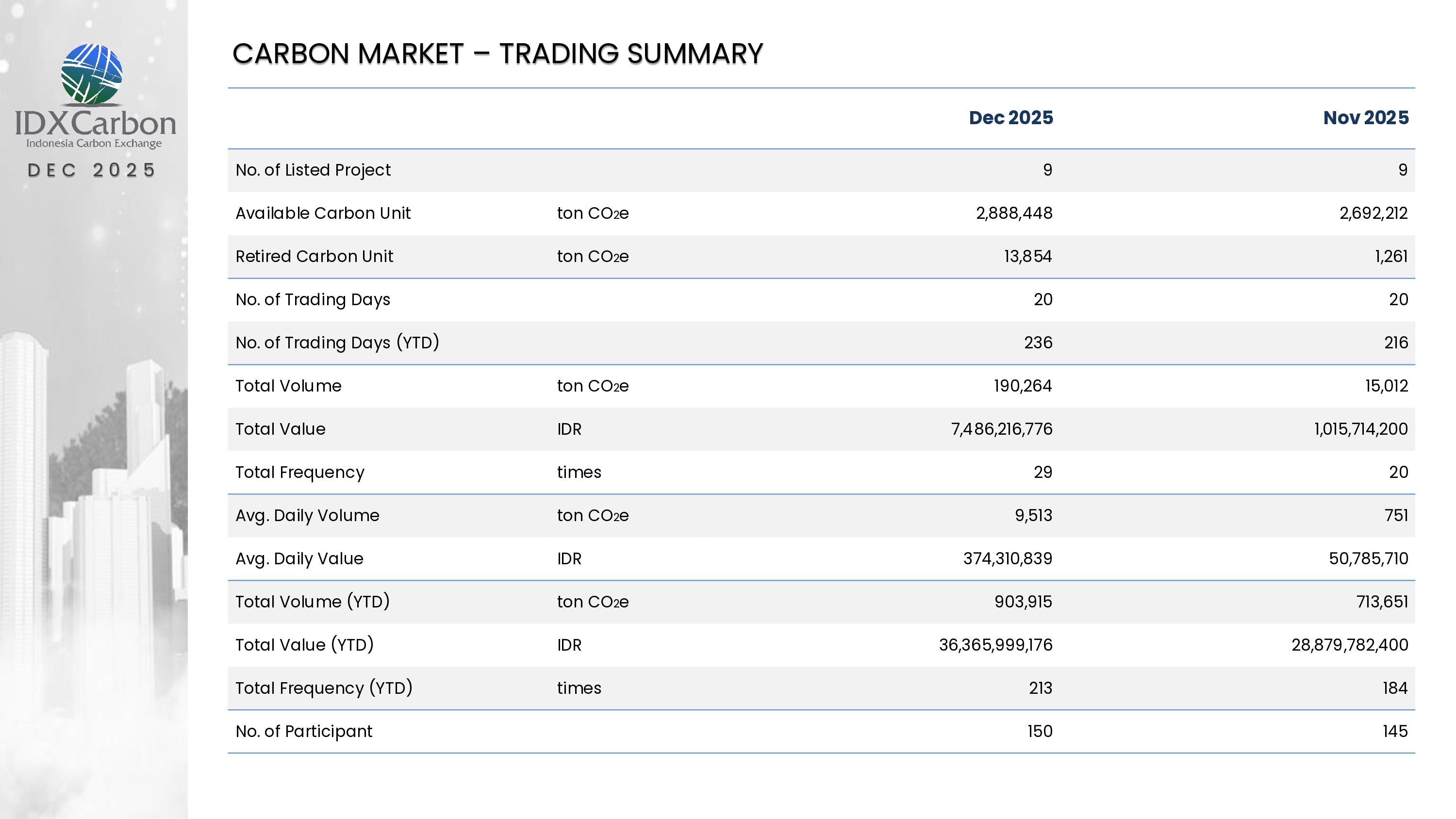 Berdasarkan data yang dihimpun pada idxcarbon.co.id, pada Desember 2025, aktivitas perdagangan karbon menunjukkan dinamika pasar yang cukup aktif dan berkembang, baik dari sisi ketersediaan unit karbon, intensitas transaksi, maupun partisipasi pelaku pasar. Pada periode ini, tercatat 9 proyek karbon terdaftar di pasar karbon. Total unit karbon yang tersedia mencapai 2.888.448 ton CO₂e, mencerminkan kapasitas pasokan yang relatif besar untuk mendukung kebutuhan pasar. Dari jumlah tersebut, sebanyak 13.854 ton CO₂e telah diretir (retired), yang menunjukkan adanya komitmen pelaku pasar dalam mengimbangi emisi karbon secara nyata. Perdagangan karbon selama Desember 2025 berlangsung selama 20 hari perdagangan. Dalam periode tersebut, total volume transaksi tercatat sebesar 190.264 ton CO₂e, dengan total nilai transaksi mencapai Rp7.486.216.776. Rata-rata aktivitas harian pada bulan tersebut menunjukkan volume perdagangan harian sebesar 9.513 ton CO₂e dengan nilai perdagangan mencapai Rp374.310.839. Angka ini mencerminkan likuiditas pasar yang mulai terbentuk, dengan transaksi bernilai cukup besar per hari. Secara kumulatif, total volume perdagangan YTD sebesar 903.915 ton CO2e, total nilai perdagangan YTD mencapai Rp36.365.999.176, dan total frekuensi transaksi YTD sebanyak 213 kali. Pada Desember 2025 juga disampaikan bahwa terdapat 150 peserta pasar yang terlibat pada alur perdagangan, yang menandakan adanya partisipasi yang cukup luas dari berbagai pemangku kepentingan.
