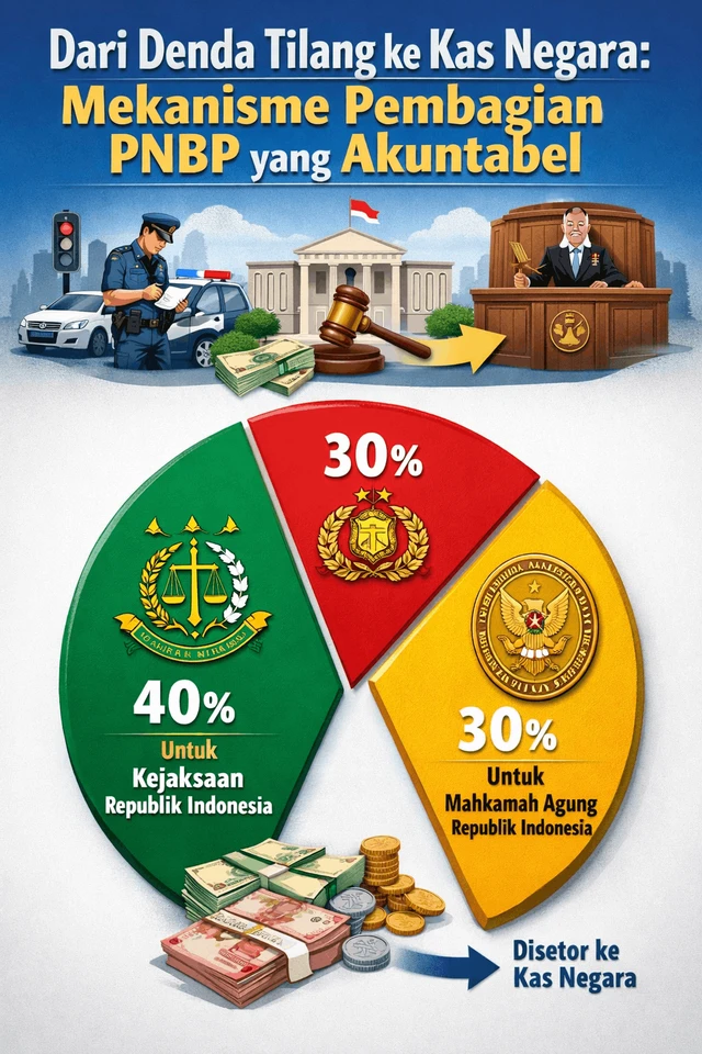 Pengelolaan keuangan negara menuntut adanya sistem yang transparan, akuntabel, dan tertib administrasi. Salah satu komponen penting dalam pengelolaan tersebut adalah Penerimaan Negara Bukan Pajak (PNBP) yang berasal dari berbagai sumber, termasuk dari pembayaran denda tindak pidana pelanggaran Lalu Lintas dan Angkutan Jalan (LLAJ). Denda tilang yang disetorkan ke kas negara merupakan bagian dari penerimaan negara yang selanjutnya perlu dikelola dan dibagikan kepada instansi terkait sesuai dengan ketentuan yang berlaku.