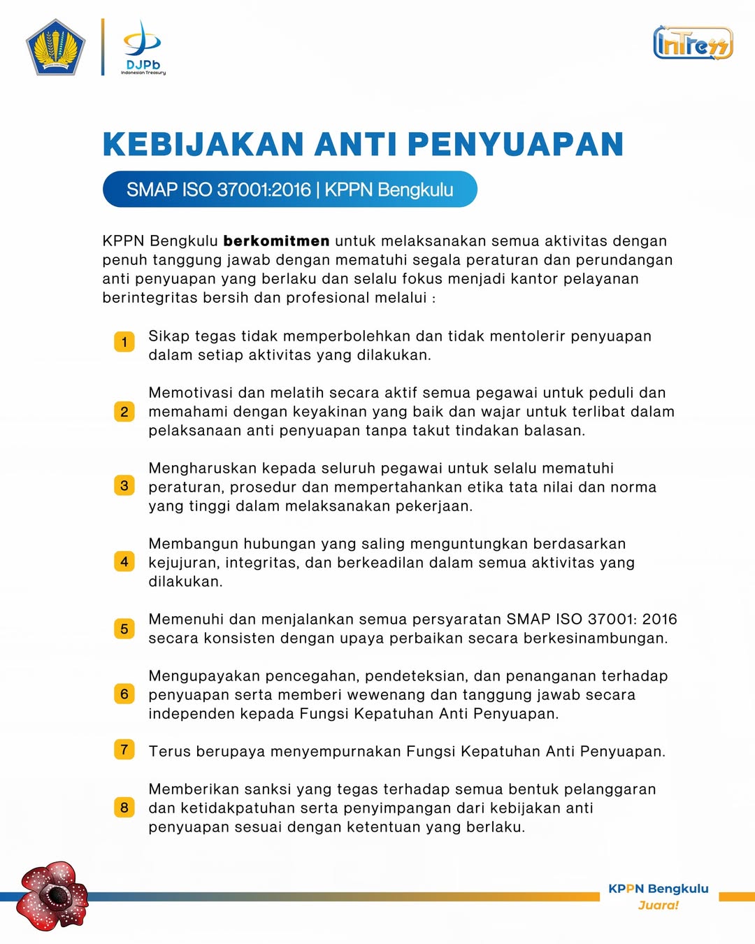 KPPN Bengkulu, berpedoman pada SMAP ISO 37001:2016, berkomitmen untuk terus melaksanakan upaya-upaya yang berkaitan dengan kebijakan anti penyuapan. Kebijakan ini tentunya selaras dengan salah satu nilai Kementerian Keuangan yaitu Integritas. Dengan demikian, KPPN Bengkulu dapat terus menyajikan pelayanan dengan bersih, jujur, dan transparan demi terciptanya good governance.