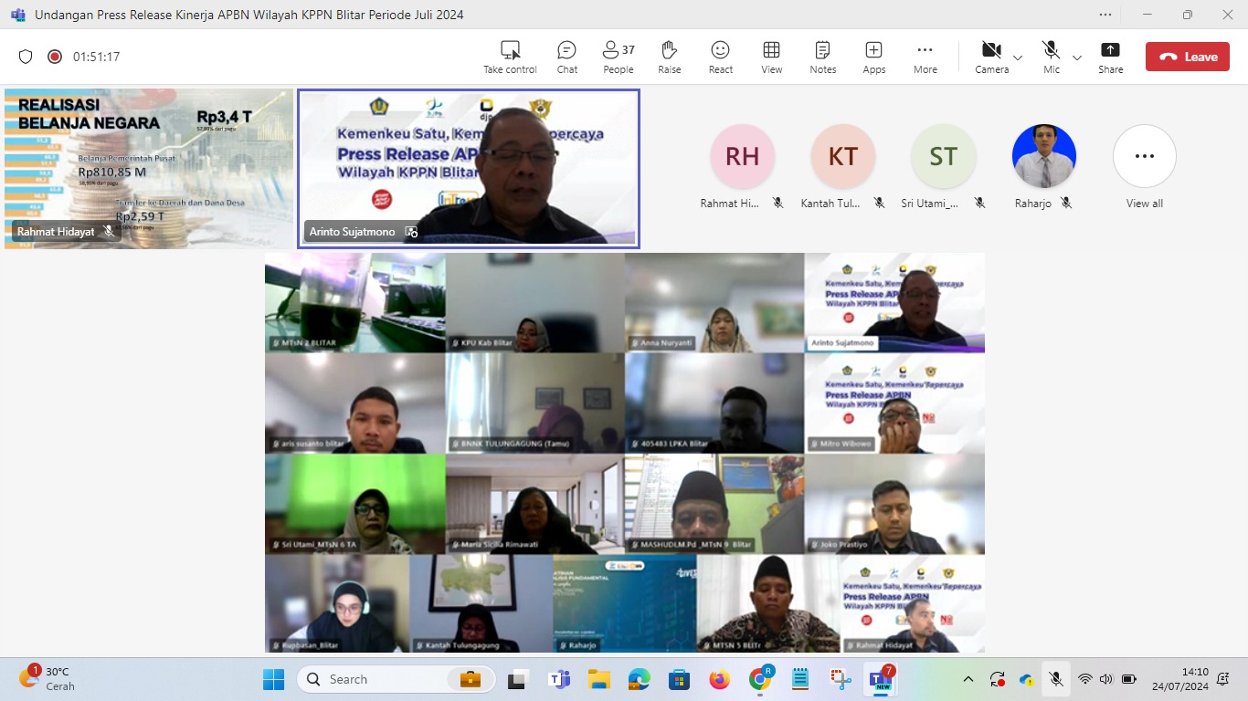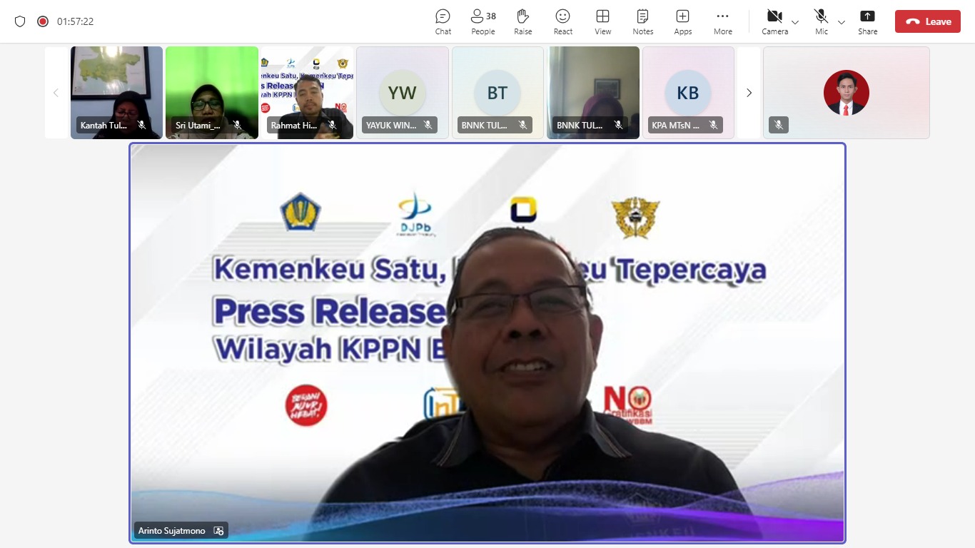 “Kinerja APBN Wilayah Blitar dan Tulungagung sampai dengan 30 Juni 2024 terus menunjukkan hasil yang positif dibandingkan tahun sebelumnya. APBN 2024 sebagai shock absorber, Mendukung Kebijakan Perekonomian Nasional di Tengah Ketidakpastian Global” jelas Kepala Kantor Pelayanan Perbendaharaan Negara Blitar Arinto Sujatmono pada Konferensi Pers APBN KiTa Regional Blitar Periode Data s.d. 30 Juni 2024 di Blitar, Selasa (24/07).