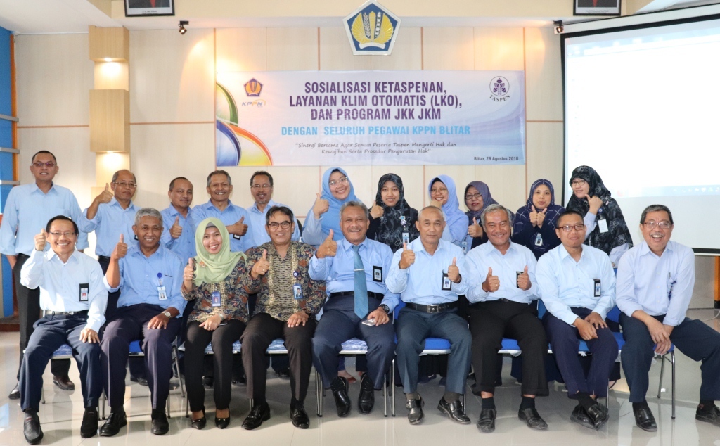 Blitar, http://www.djpbn.kemenkeu.go.id/kppn/blitar/id/ - Bertempat di Aula lantai II KPPN Blitar, Rabu (29/8), kegiatan Sosialisasi Ketaspenan, Layanan Klim Otomatis (LKO) dan Program JKK JKM diselenggarakan berkat Sinergi dan Kerjasama yang terjalin apik antara PT Taspen Kantor Cabang Kediri dan KPPN Blitar. Kegiatan tersebut mengusung tema "Sinergi Bersama Agar Semua Peserta Taspen Mengerti Hak dan Kewajiban serta Prosedur Pengurusan Hak"
