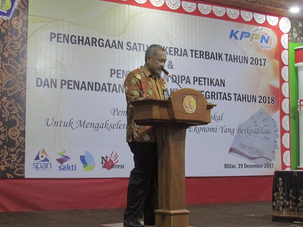 Dalam sambutan yang disampaikan Herbudi Adrianto, Kepala KPPN Blitar mengamanatkan bahwa APBN 2018 di bidang belanja Negara, dinilai masih terdapat beberapa tantangan yang perlu terus diperbaiki, diantaranya, Perbaikan efektifitas belanja Negara agar betul-betul berbasis output dan memberikan manfaat yang optimal (value for money) pada pencapaian sasaran. Efisiensi belanja operasional, peningkatan sistem monitoring dan evaluasi anggaran, perbaikan tata kelola keuangan, mulai dari perencanaan sampai dengan pertanggungjawaban, serta pencegahan dan pemberantasan penyalahgunaan penggunaan anggaran dari pusat hingga ke daerah.