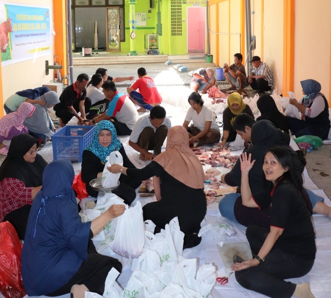 Tampak raut wajah semangat dan kegembiraan terpancar segenap pegawai dan hadirin yang turut serta memotong-motong daging, menimbangnya kemudian memasukkan kedalam tas-tas kantong untuk kemudian didistribusikan kepada para mustahiq.
