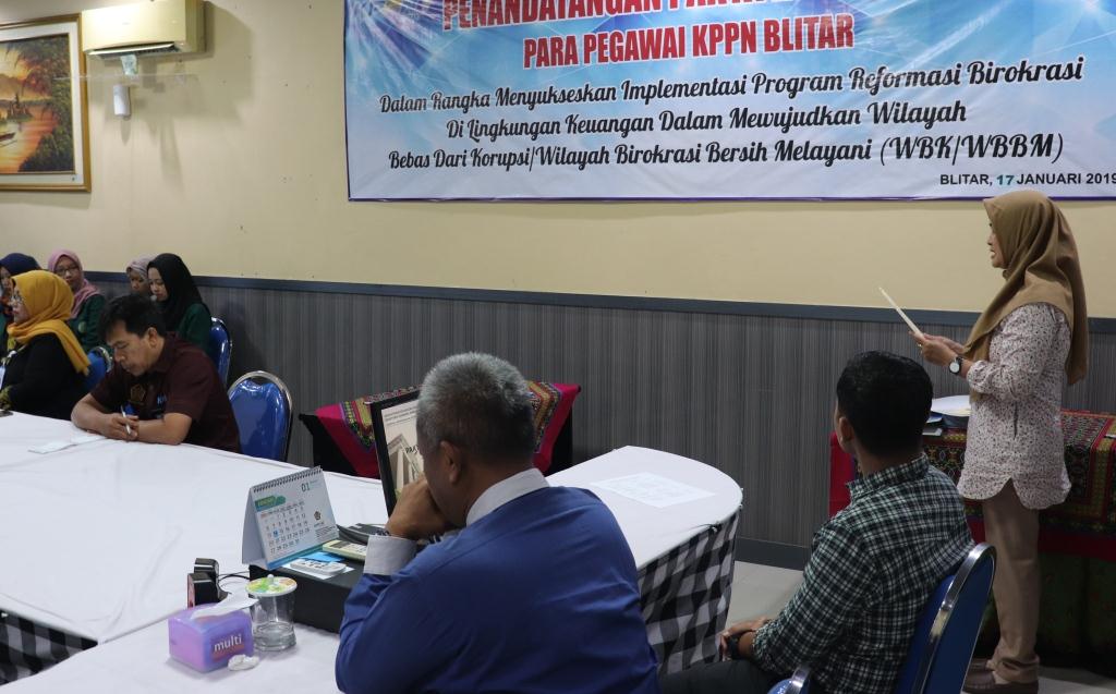 Penandatanganan Pakta Integritas merupakan langkah dalam pelaksanaan reformasi birokrasi dan transformasi kelembagaan serta komitmen untuk melakukan pencegahan dan pemberantasan tindak koruptif, Pakta Integritas sebagai bagian dari Program Pengendalian Grattifikasi agar pejabat/pegawai KPPN Blitar untuk tidak melakukan hal-hal yang berlawanan dengan kewajiban atau tugasnya. Pakta Integritas sejatinya merupakan komitmen pejabat/pegawai untuk tunduk/patuh pada ketentuan yang tertuang di dalamnya dan bersedia menerima konsekuensi jika melanggar ketentuan dimaksud, demikian arahan Herbudi Adrianto, Kepala KPPN Blitar.