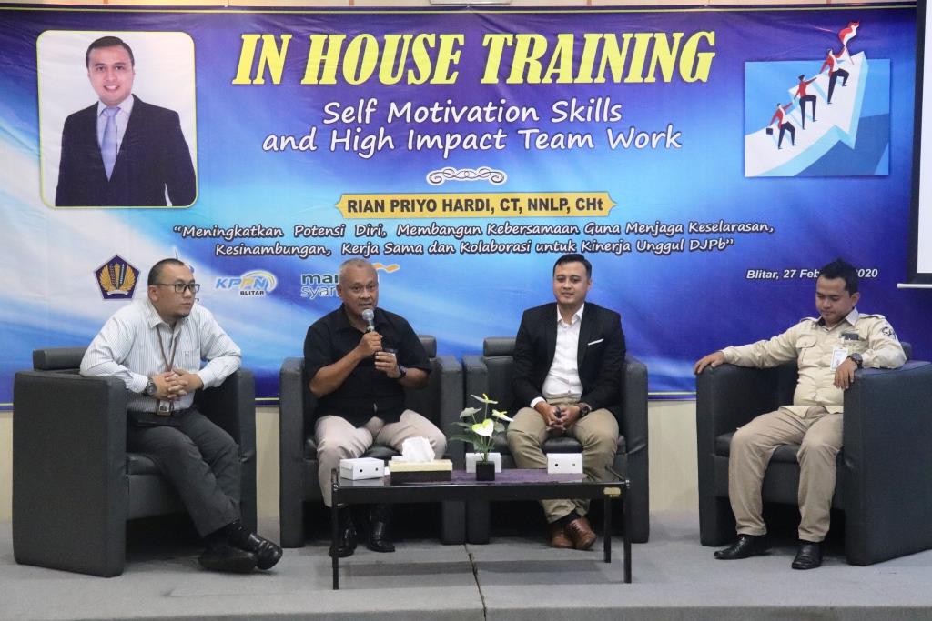 Professional Trainer, Rian Priyo Hardi akrab dengan panggilan akrab Mas Rian, bertindak selaku fasilitator gelaran kegiatan In House Training (IHT) bagi pejabat/pegawai KPPN Blitar, Kamis (27/2) bertempat di Aula KPPN, dengan mengusung tema “Meningkatkan Potensi Diri, Membangun Kebersamaan, Kesinambungan, Kerja Sama dan Kolaborasi untuk Kinerja Unggul DJPb, Unity in Diversity, Sinergi dalam Keragaman untuk Kinerja Unggul DJPb "