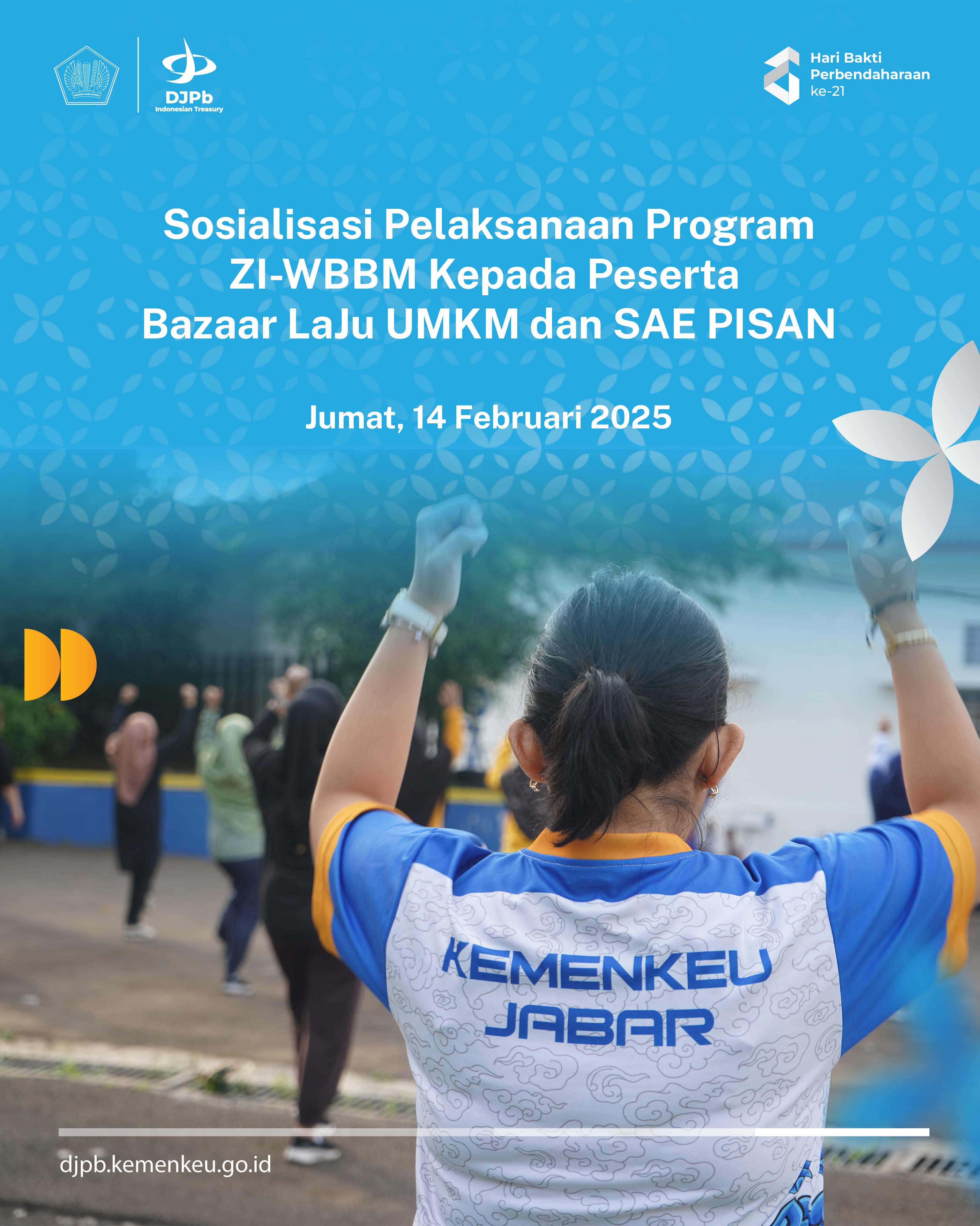 Pada Jumat, 14 Februari 2025, KPPN Bogor melaksanakan kegiatan Sosialisasi Program Zona Integritas - Wilayah Birokrasi Bersih dan Melayani (ZI - WBBM) kepada peserta Bazaar LaJu UMKM dan SAE PISAN (Sarana Pemberdayaan Ekonomi Penyandang Disabilitas dan Kelompok Rentan). Acara ini diawali dengan senam bersama dan dilanjutkan dengan bazaar LaJu UMKM dan SAE PISAN. Acara ini berlangsung di Lapangan Volley KPPN Bogor. Seluruh peserta hadir secara fisik dalam kegiatan ini.