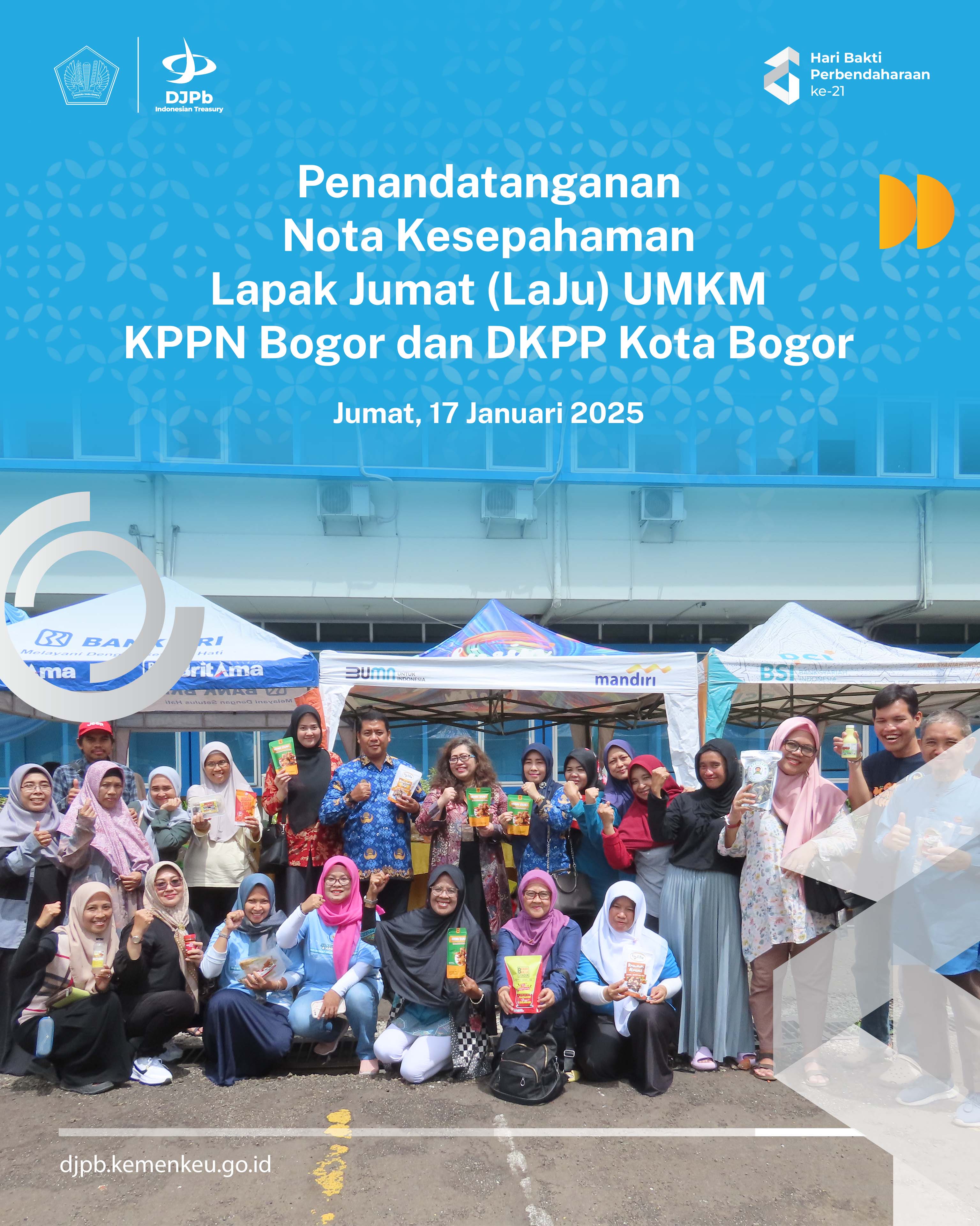 KPPN Bogor menyelenggarakan kegiatan penandatanganan nota kesepahaman (MoU) inovasi Lapak Jumat (LaJu) UMKM bersama Dinas Ketahanan Pangan dan Pertanian (DKPP) Kota Bogor pada Jumat, 17 Januari 2025 di KPPN Bogor. Nota kesepahaman ditandatangani langsung oleh Kepala KPPN Bogor, Ibu Astriyani, serta Kepala DKPP Kota Bogor, Bapak Chusnul Rozaki.