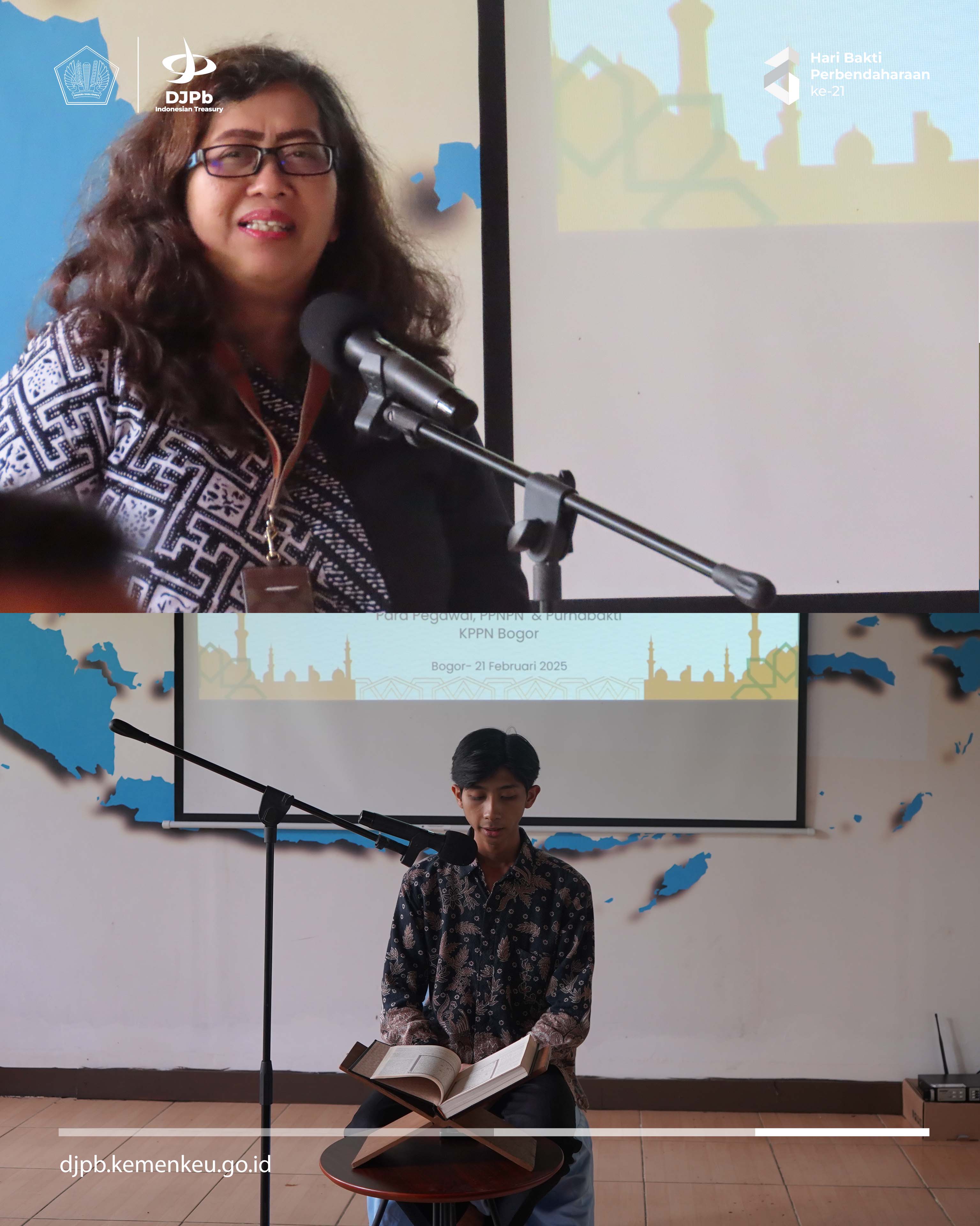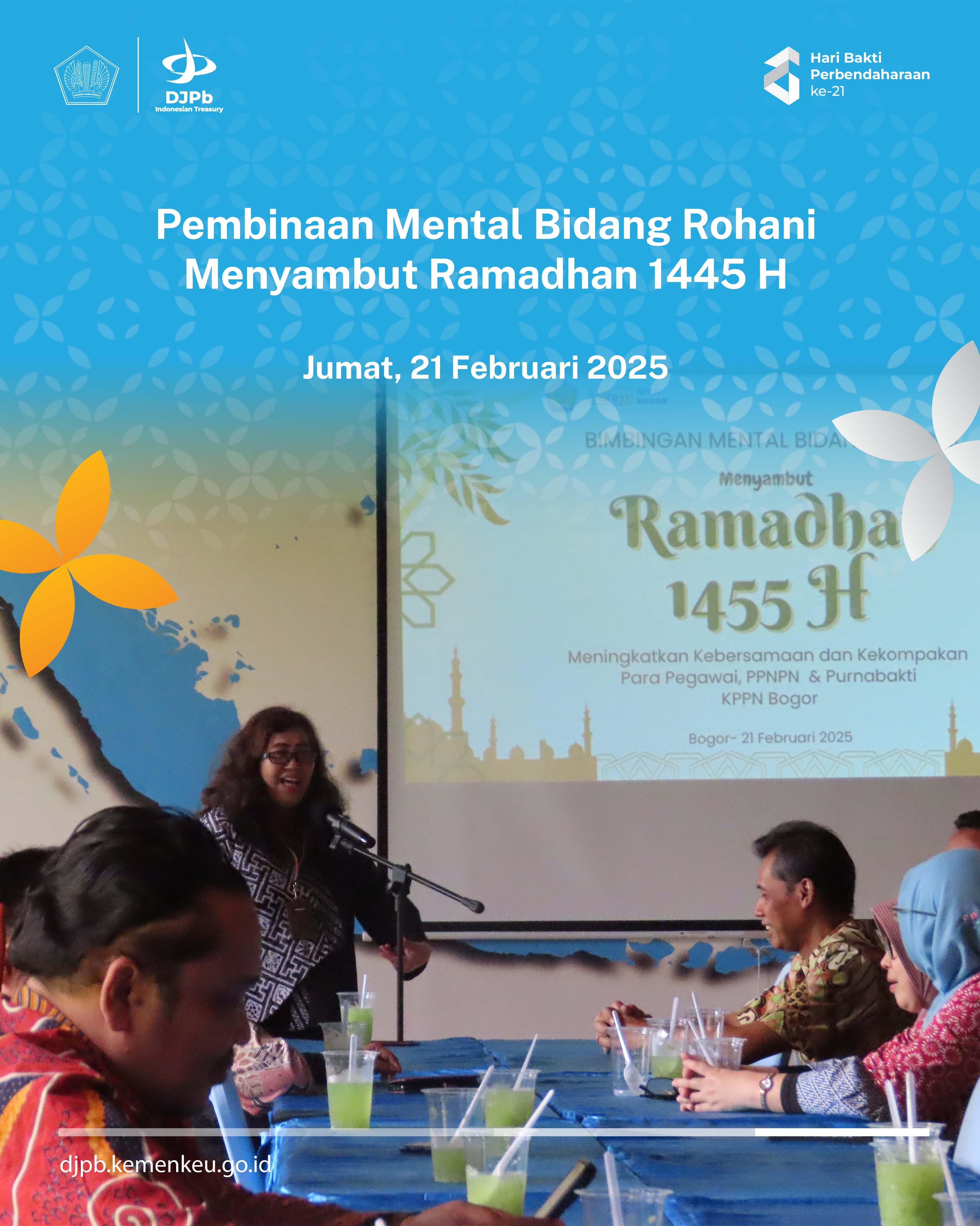 Pada Jumat, 21 Februari 2025, Kantor Pelayanan Perbendaharaan Negara (KPPN) Bogor melaksanakan kegiatan Pembinaan Mental Bidang Rohani dalam rangka menyambut bulan Ramadhan 1445 H. Acara ini berlangsung secara offline di Pendopo KPPN Bogor dan dihadiri oleh Kepala kantor, para pegawai termasuk PPNPN, serta Purnabakti KPPN Bogor.