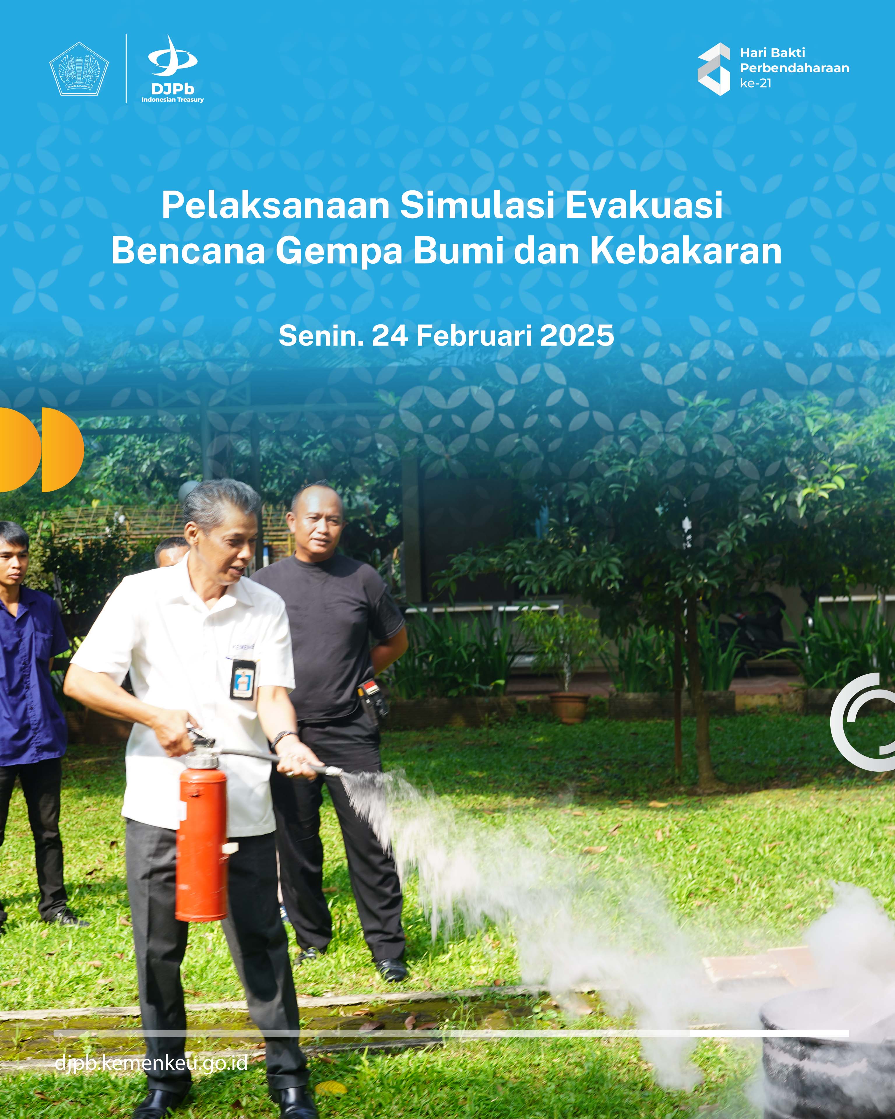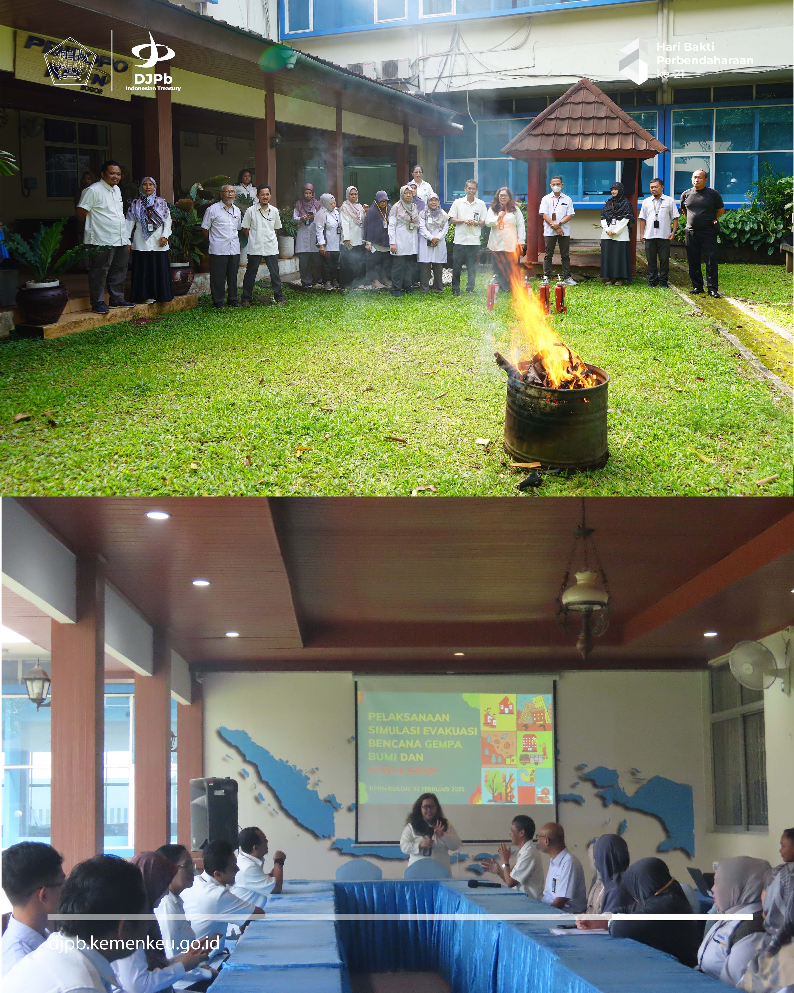 Pada Senin, 24 Februari 2025, Kantor Pelayanan Perbendaharaan Negara (KPPN) Bogor melaksanakan kegiatan Simulasi Evakuasi Bencana Gempa Bumi dan Kebakaran. Acara ini berlangsung di Pendopo KPPN Bogor dan dihadiri oleh Kepala Kantor dan para pegawai termasuk PPNPN KPPN Bogor. Kegiatan diawali dengan sosialisasi evakuasi gempa dan dilanjutkan dengan simulasi penggunaan APAR.