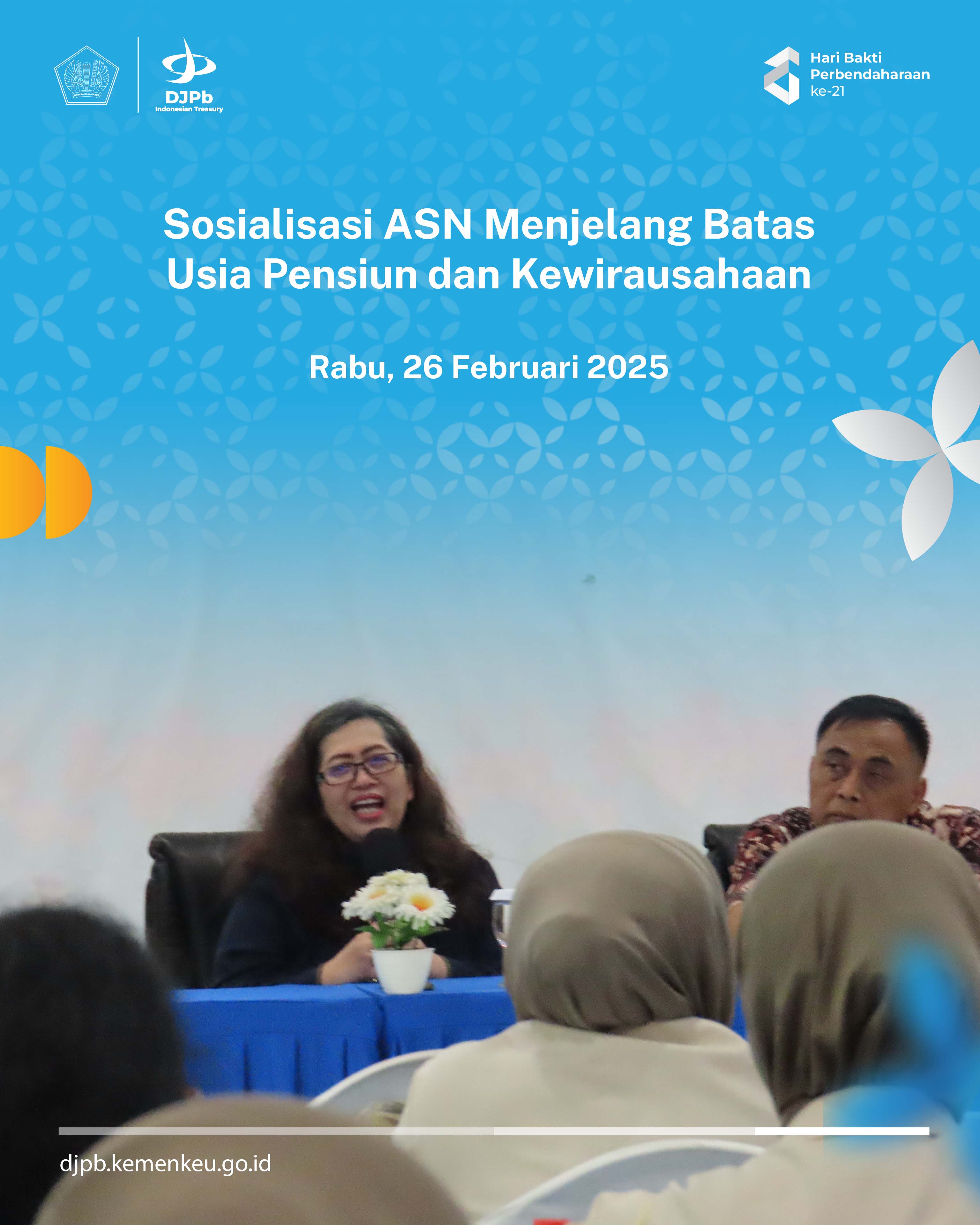 Pada Rabu, 26 Februari 2025, KPPN Bogor melaksanakan kegiatan Sosialisasi Kepada anggota TNI/Polri dan PNS lingkup Kementerian Pertahanan Menjelang Batas Usia Pensiun dan Kewirausahaan. Acara ini merupakan kolaborasi antara KPPN Bogor, PT Asabri, dan Bank Mandiri Taspen. Acara berlangsung di Aula KPPN Bogor dan dihadiri oleh Kepala KPPN Bogor, Kepala KCU PT Asabri, dan Kepala Bank Mandiri Taspen Kantor Cabang Bogor, serta para anggota TNI/Polri dan PNS lingkup Kementerian Pertahanan menjelang pensiun di wilayah KPPN Bogor.