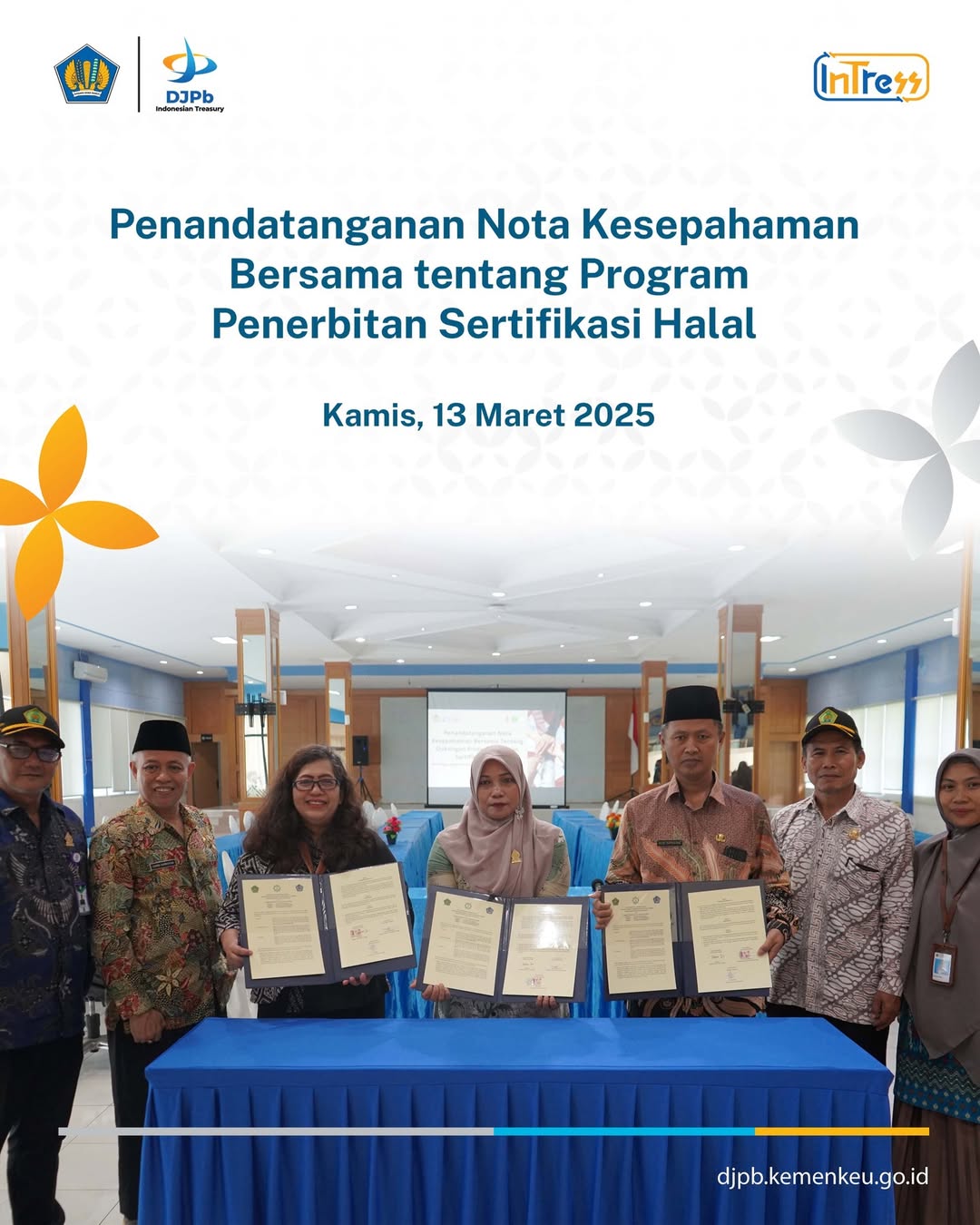 Pada Kamis, 13 Maret 2025, KPPN Bogor melaksanakan kegiatan Penandatanganan Nota Kesepahaman Bersama tentang Program Penerbitan Sertifikasi Halal. Acara ini berlangsung di aula KPPN Bogor dan dihadiri oleh Kepala KPPN Bogor, pegawai KPPN Bogor, Kepala Kantor Kementerian Agama Kota Bogor, serta Direktur Lembaga Pemeriksa Halal-LPH Arsy Indonesia.