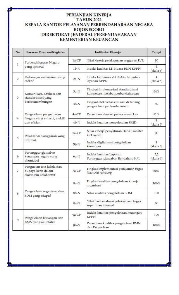 Standar Pelayanan pada KPPN Tipe A2 Bojonegoro mengacu pada Keputusan Direktur Jenderal Perbendaharaan Nomor KEP-57/PB/2023 tentang Standar Pelayanan di Lingkungan Direktorat Jenderal Perbendaharaan