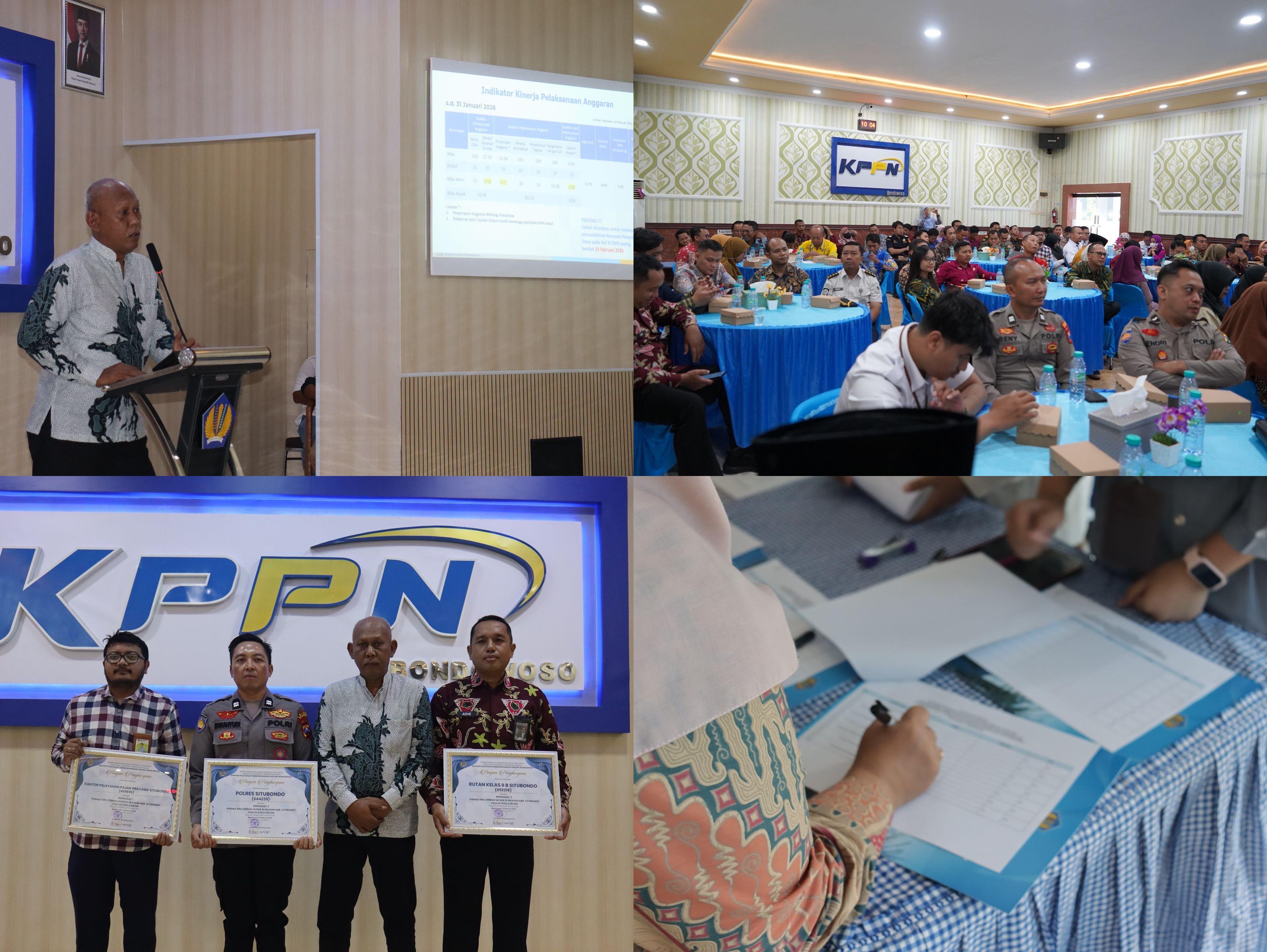 Dalam rangka meningkatkan kualitas pelaksanaan anggaran serta memperkuat sinergi dengan satuan kerja mitra, KPPN Bondowoso menyelenggarakan kegiatan Sosialisasi Kebijakan Perbendaharaan/Keuangan Negara yang dirangkaikan dengan Press Conference Kinerja APBN, Focus Group Discussion (FGD) Evaluasi Pelaksanaan Anggaran Satuan Kerja Semester II Tahun 2025, Sosialisasi Langkah-Langkah Strategis Pelaksanaan Anggaran Tahun Anggaran 2026, serta Stakeholders Day 2026. Kegiatan ini dilaksanakan pada Kamis, 12 Februari 2026, bertempat di Aula KPPN Bondowoso.