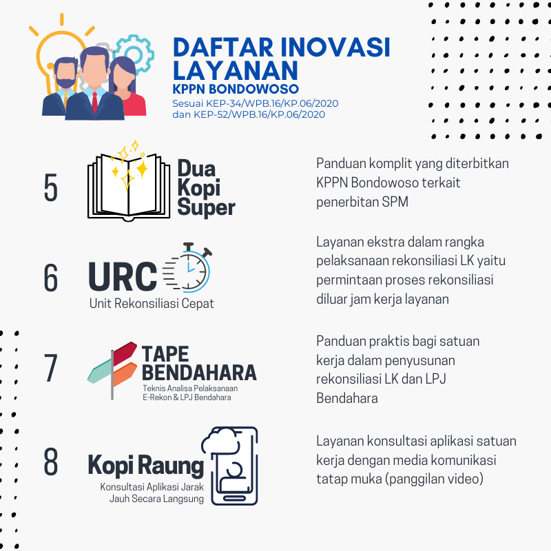 Sehubungan dengan diterbitkannya KEP-34/WPB.16/KP.06/2020 dan KEP-52/WPB.16/KP.06/2020, KPPN Bondowoso telah menetapkan inovasi layanan sebagai berikut: