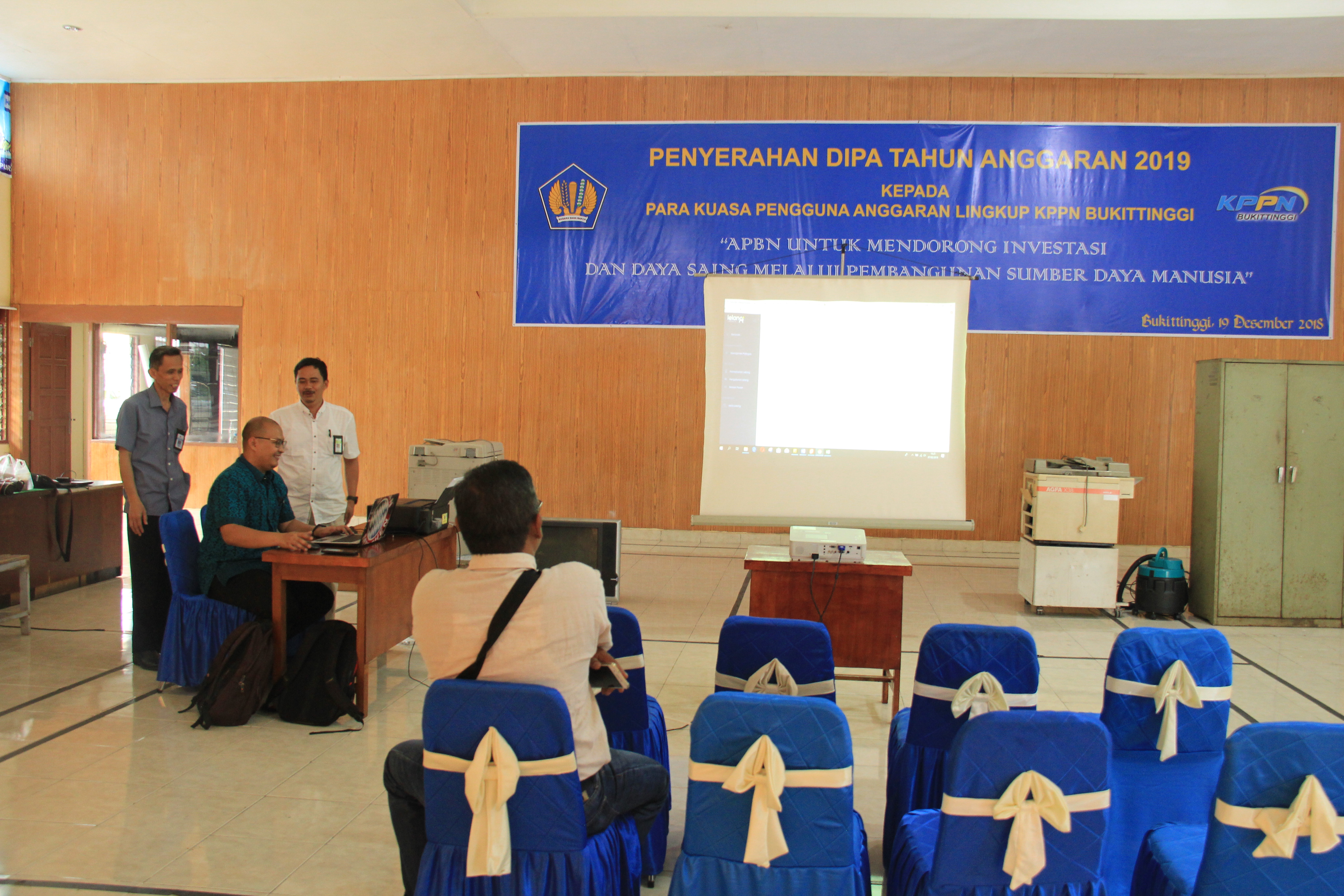 Pada Rabu 19 Desember 2018 telah dilaksanakan penyerhan Daftar Isian Pelaksanaan Anggaran (DIPA) Tahun Anggaran 2019 di KPPN Bukittinggi. Kegiatan ini dilaksanakan di aula KPPN Bukittinggi yang dihadiri oleh pada Kuasa Pengguna Anggaran lingkup pembayaran KPPN Bukittinggi.