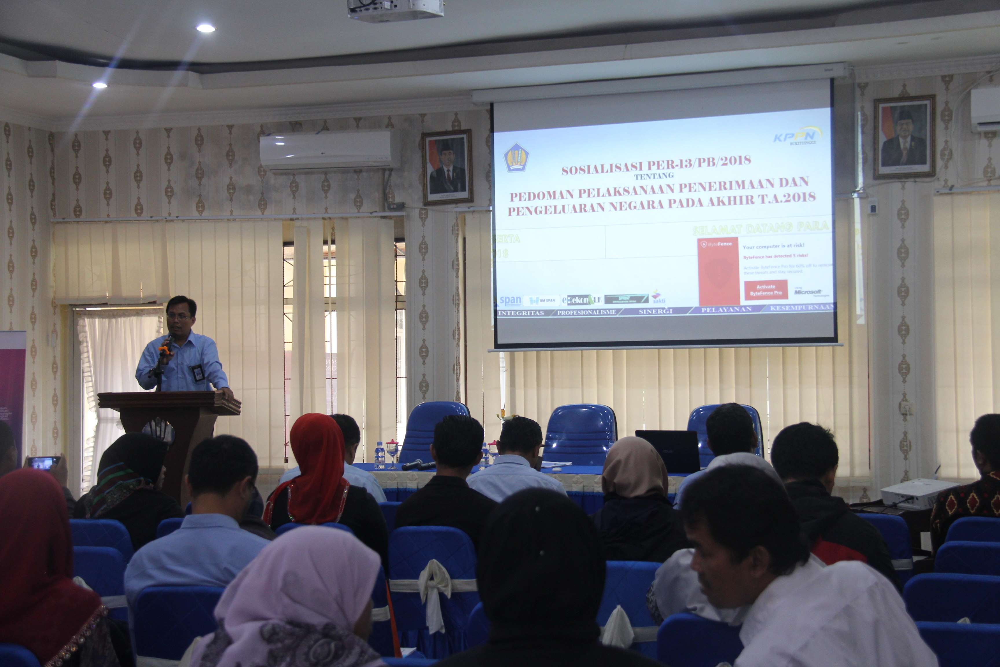 Pada hari Selasa s.d Kamis tanggal 25 s.d 27 September 2018 telah dilaksanakan Sosialisasi Peraturan Direktur Jenderal Perbendaharaan Nomor PER-13/PB/2018 tentang Pedoman Pelaksanaan Penerimaan dan Pengeluaran pada Akhir Tahun Anggaran 2018, Materi capaian Indikator Kinerja Pelaksanaan Anggaran, dan Laporan Capaian Output Prioritas Nasional.