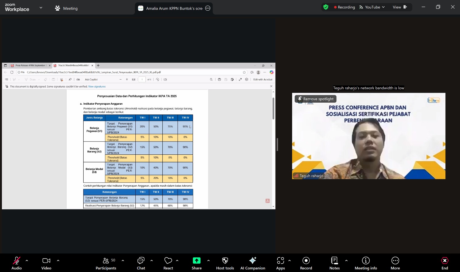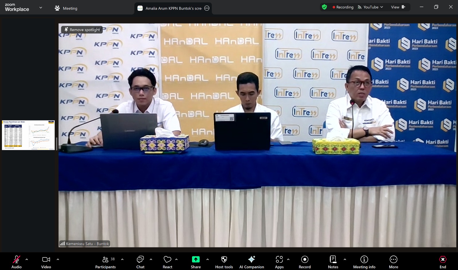 KPPN Buntok menggelar kegiatan Press Conference Kinerja APBN Bulan Oktober 2025 dan Sosialisasi Sertifikasi Pejabat Perbendaharaan secara daring melalui Zoom Meeting pada Kamis, 30 Oktober 2025. Kegiatan ini diikuti oleh perwakilan satuan kerja mitra KPPN Buntok, BPKAD dari Kabupaten Barito Selatan, Barito Timur, Barito Utara, dan Murung Raya, Perwakilan KPP Muara Teweh yaitu KP2KP Buntok, serta akademisi dari Sekolah Tinggi Ilmu Ekonomi Dahani Dahanai Buntok.