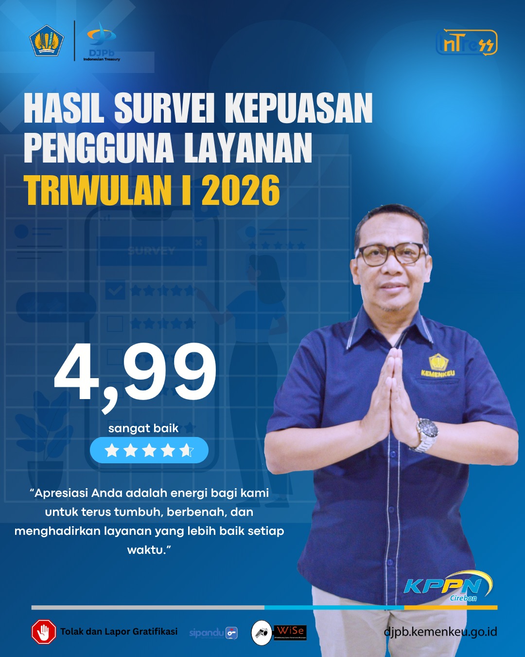 Pada survei tersebut, KPPN Cirebon meraih skor 4,99 dari skala 5,00 yang mencerminkan tingkat kepuasan pengguna layanan yang sangat baik terhadap kualitas pelayanan yang diberikan.