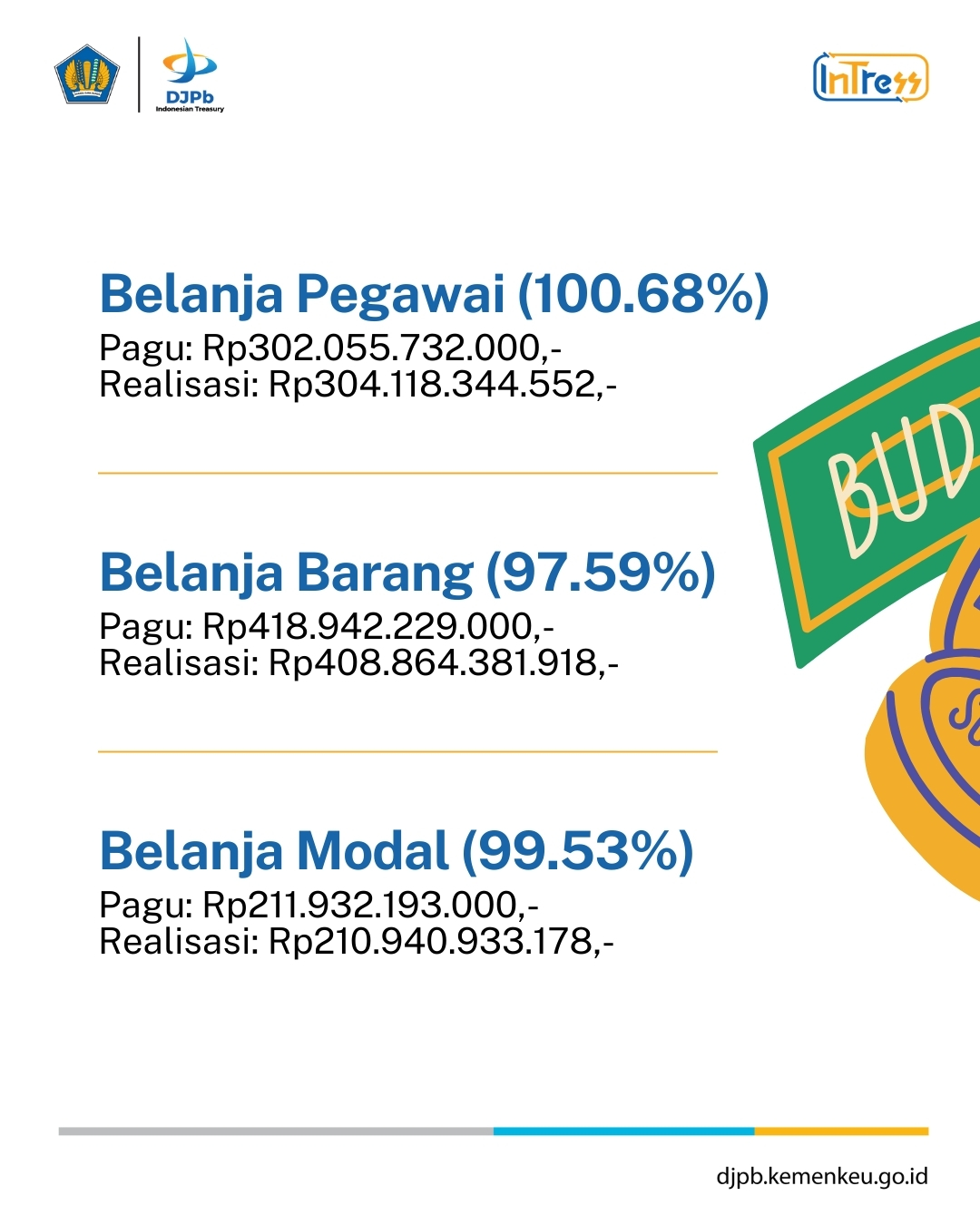Sementara itu, Belanja Barang terealisasi sebesar 97,59 persen, dengan pagu Rp418.942.229.000 dan realisasi Rp408.864.381.918. Belanja Modal mencapai 99,53 persen dari pagu Rp211.932.193.000, dengan realisasi Rp210.940.933.178.