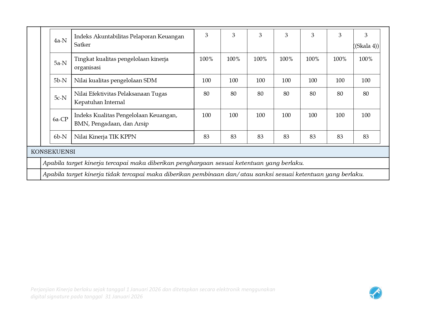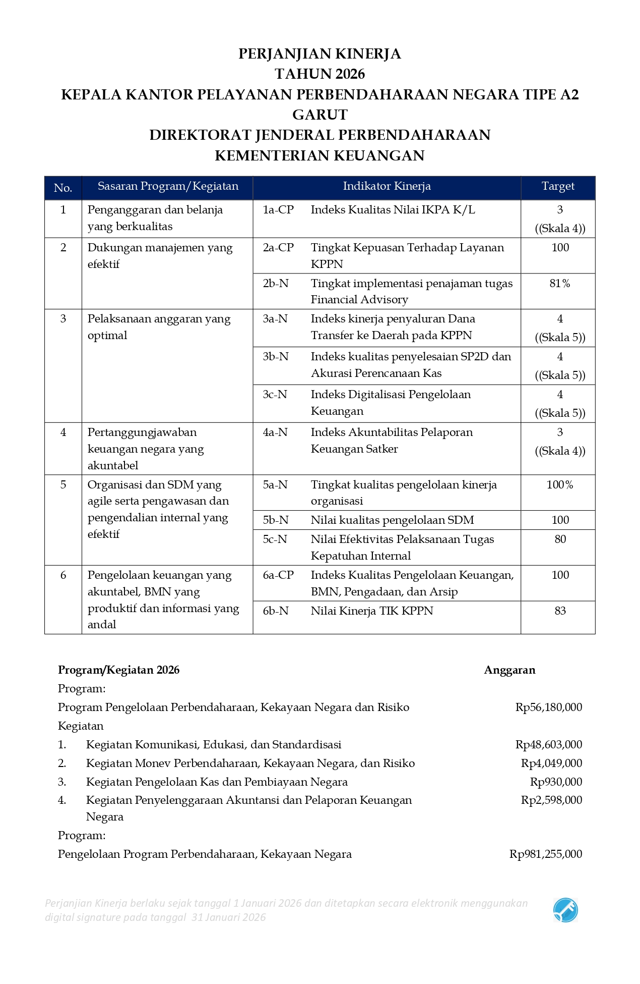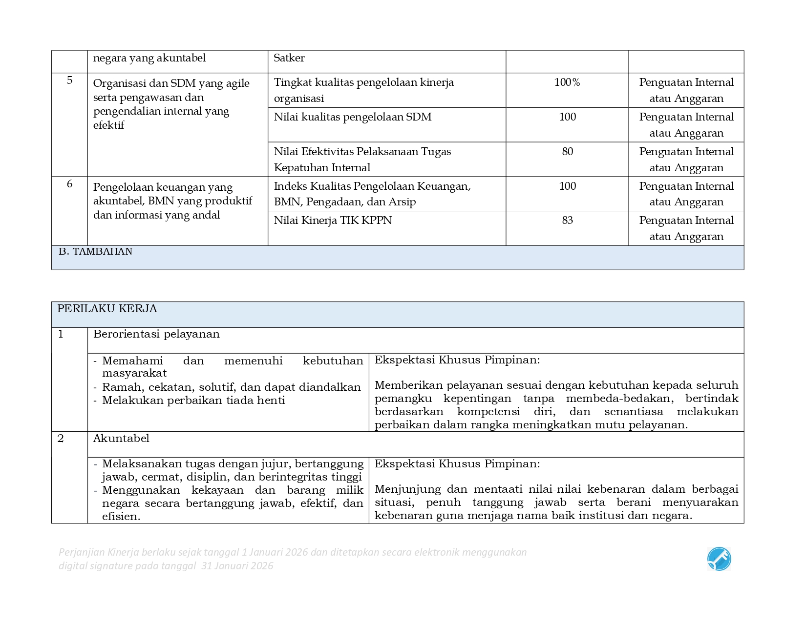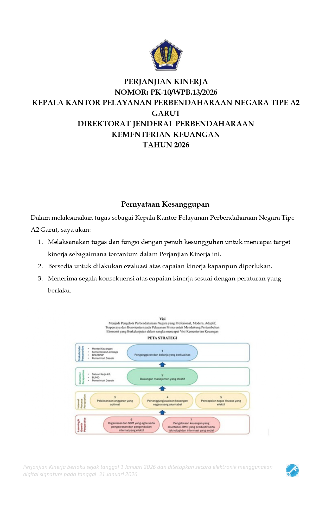 Perjanjian Kinerja (PK) merupakan dokumen kesepakatan antara Pimpinan UPK dengan Pimpinan UPK di atasnya. Perjanjian kinerja berisikan penugasan dari pimpinan instansi yang lebih tinggi kepada pimpinan instansi yang lebih rendah untuk melaksanakan program/kegiatan yang disertai dengan indikator kinerja.