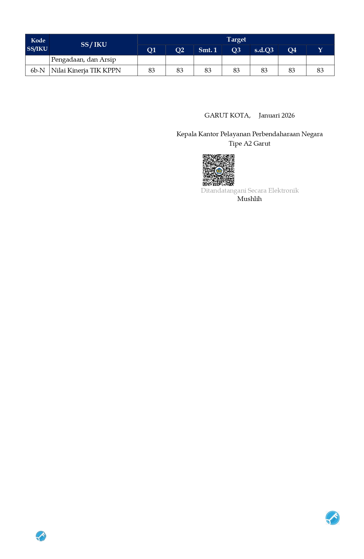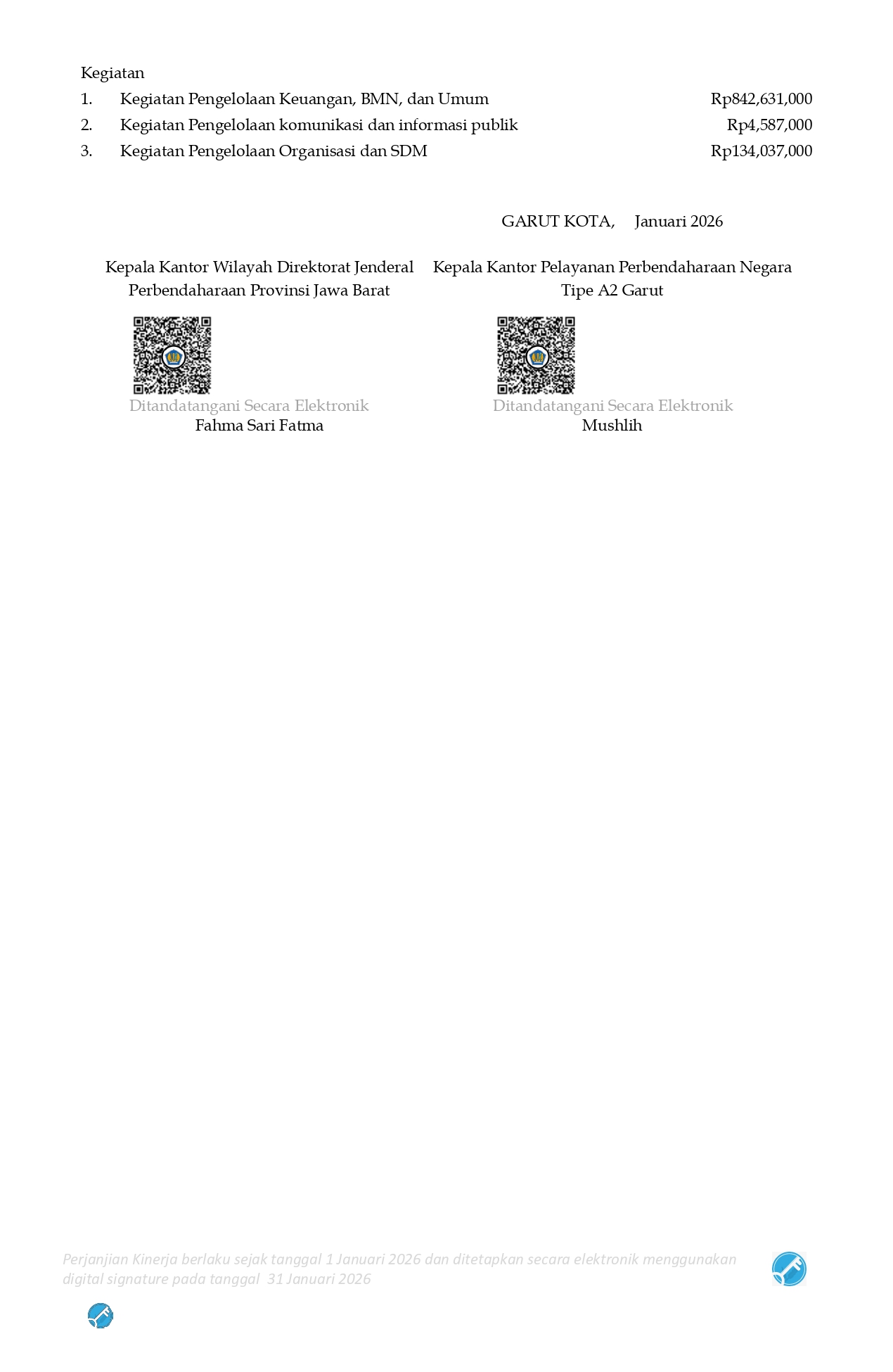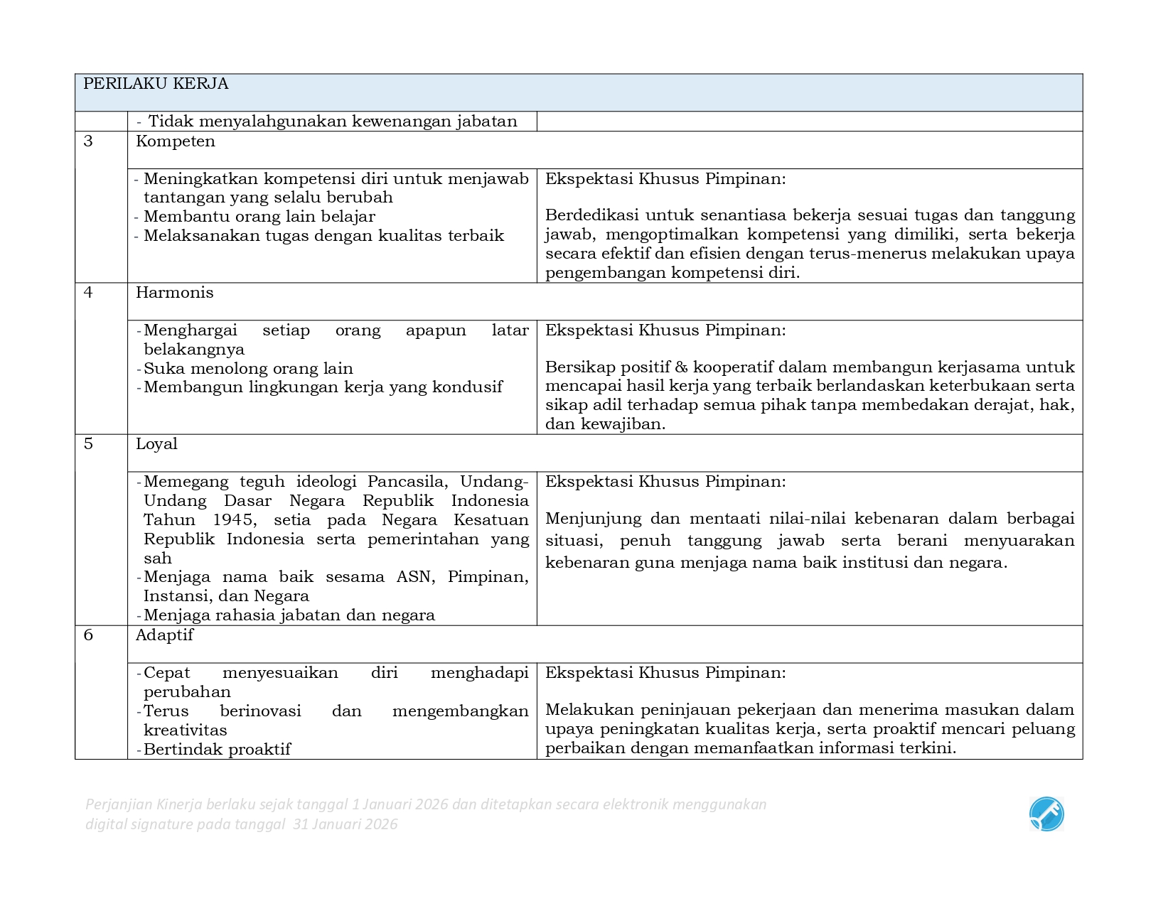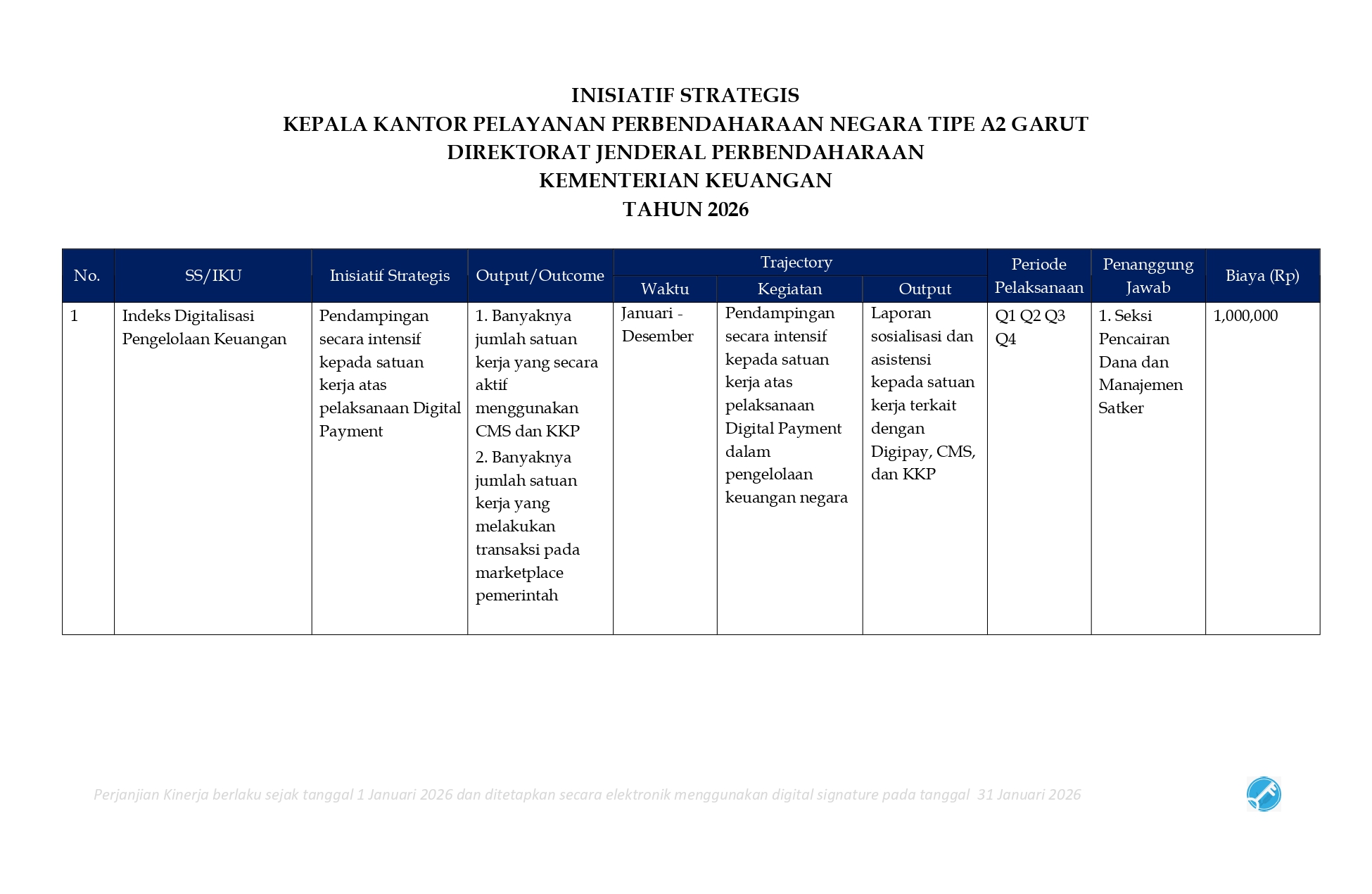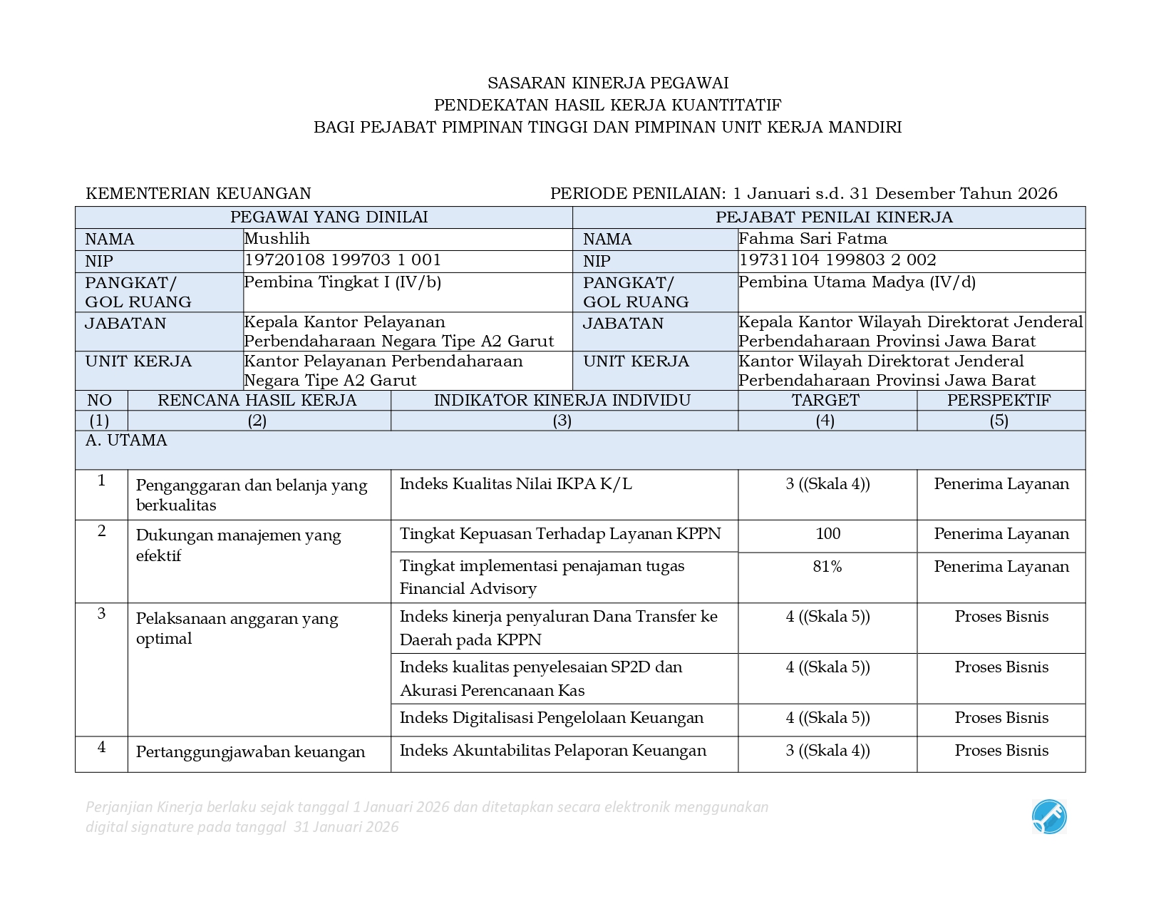 Perjanjian Kinerja (PK) merupakan dokumen kesepakatan antara Pimpinan UPK dengan Pimpinan UPK di atasnya. Perjanjian kinerja berisikan penugasan dari pimpinan instansi yang lebih tinggi kepada pimpinan instansi yang lebih rendah untuk melaksanakan program/kegiatan yang disertai dengan indikator kinerja.