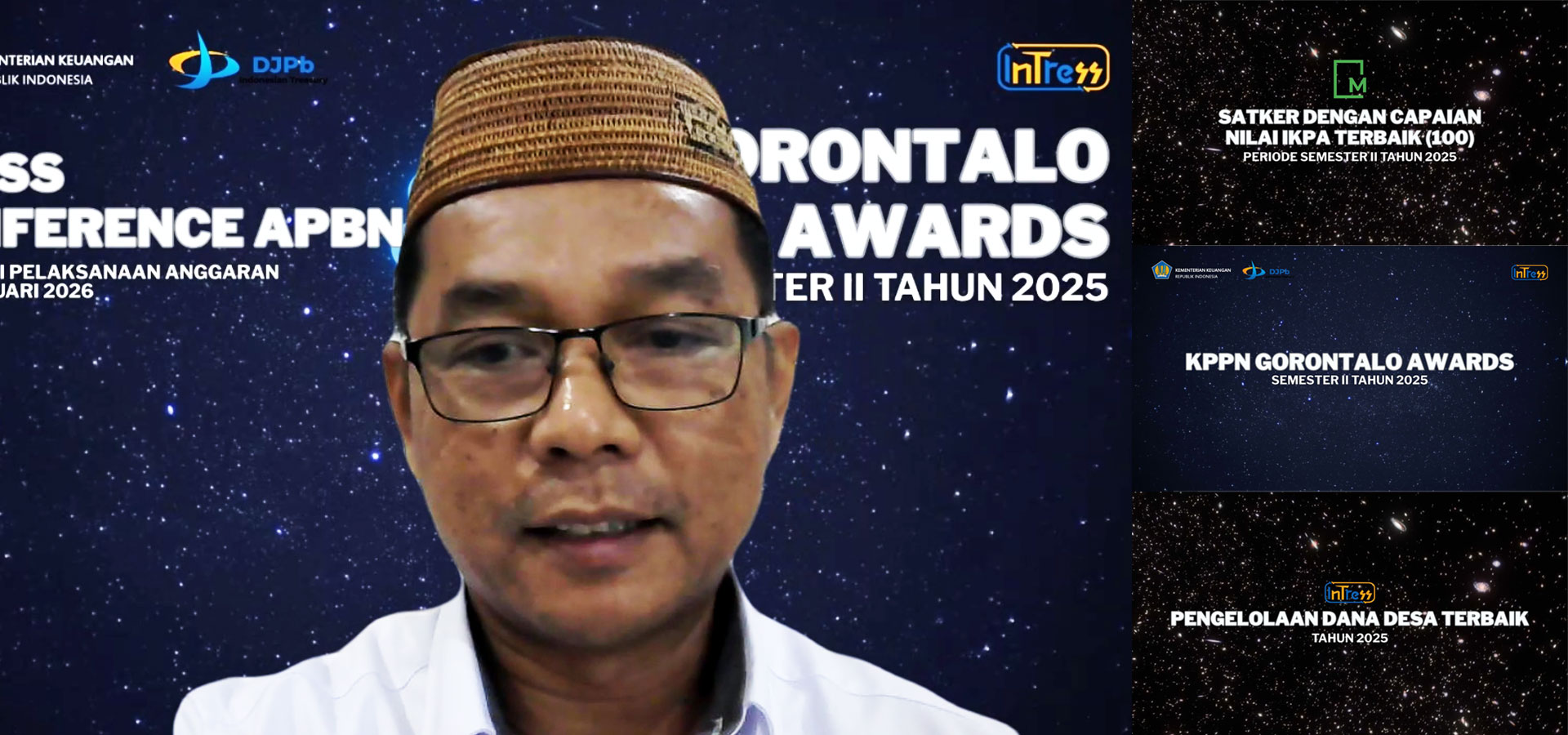 Gorontalo (26/02) – KPPN Gorontalo menyelenggarakan Treasury Award Semester II 2025 secara daring pada hari Kamis, 26 Februari 2026. Ajang ini sebagai apresiasi dan penyemangat bagi mitra kerja KPPN Gorontalo yang telah memberikan kinerja terbaik selama Semester II Tahun 2025.