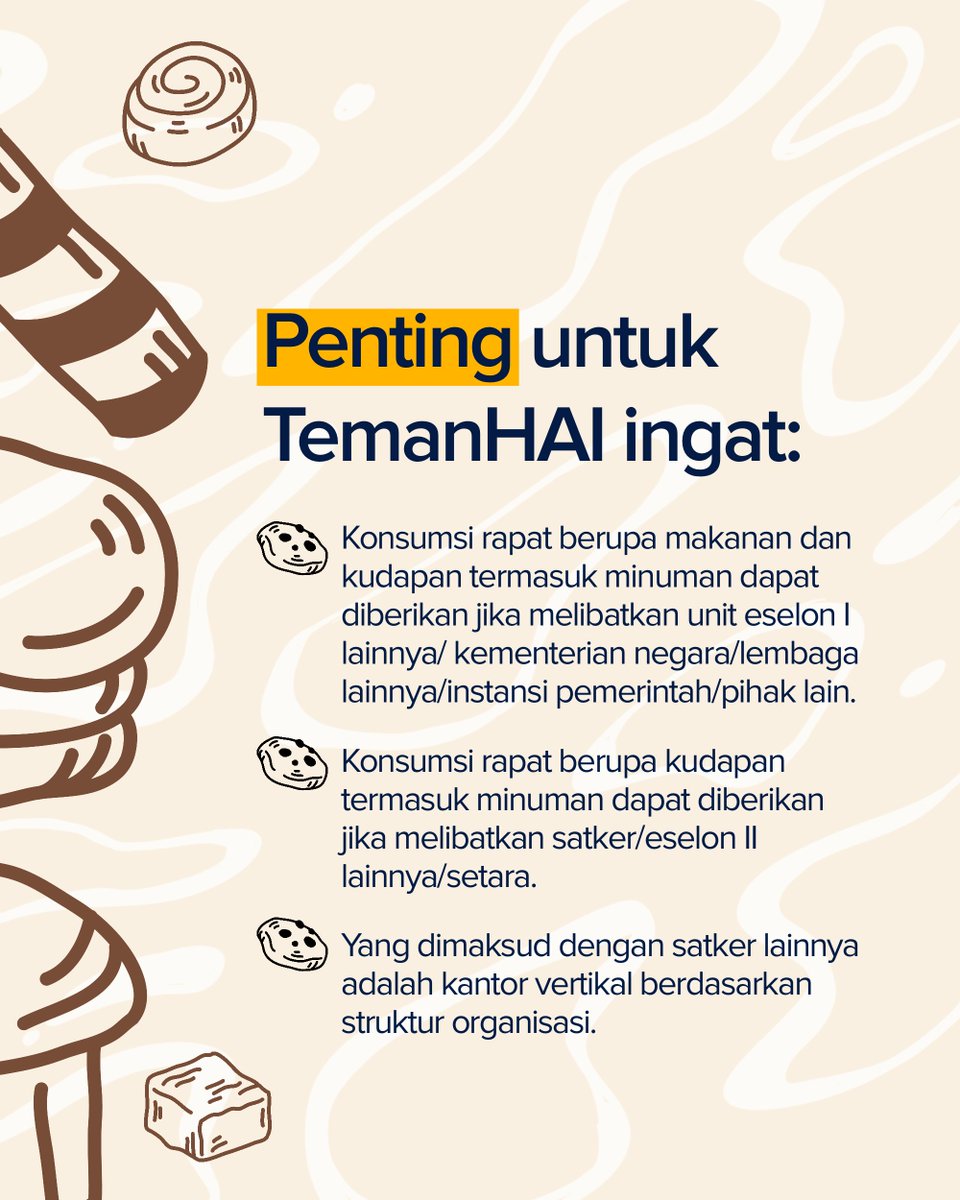 - Sepanjang memenuhi ketentuan dalam Peraturan Menteri Keuangan Nomor 32 Tahun 2025 tentang Standar Biaya Masukan Tahun Anggaran 2026, penyediaan konsumsi rapat tetap dapat diberikan sesuai dengan satuan biaya yang berlaku.